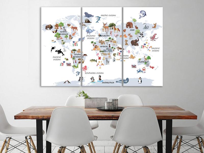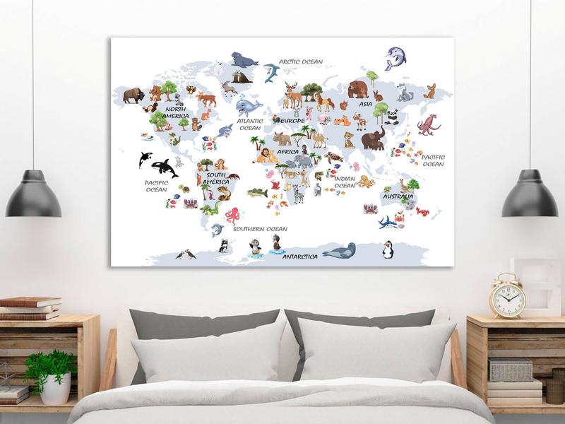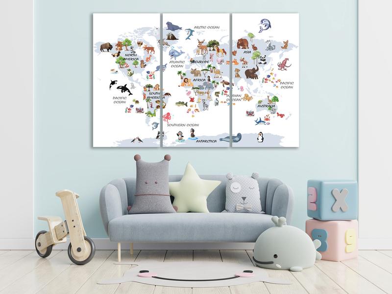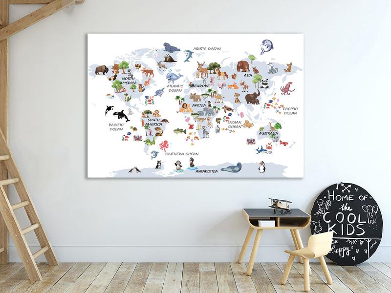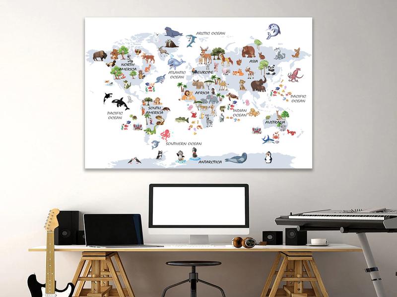 Картина печать на холсте детская "Карта мира" с животными, декор на стену в