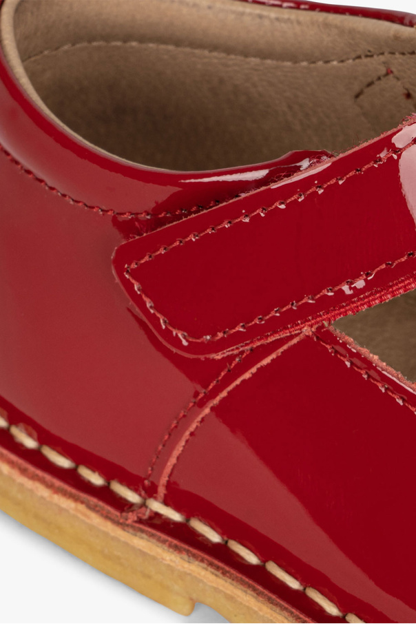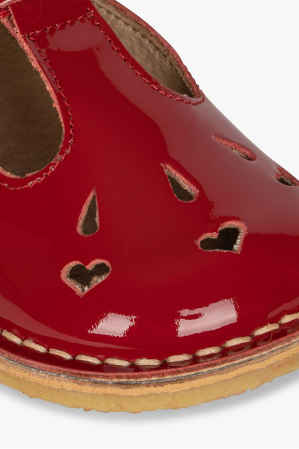 Dark red ‘Chou’ shoes from Konges Slojd. Crafted from patent leather, this model sits on a beige rubber sole and features velcro closures and cutout heart detailing.