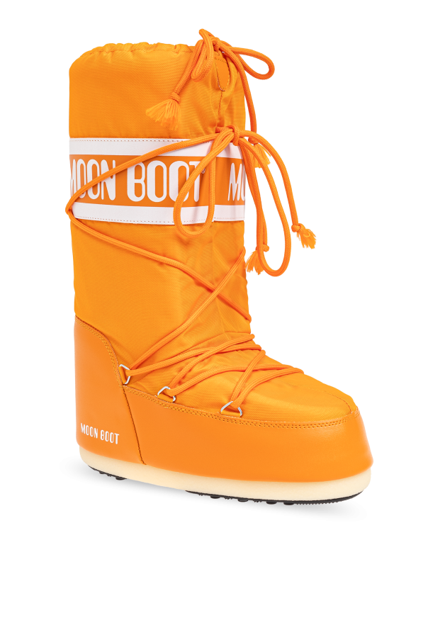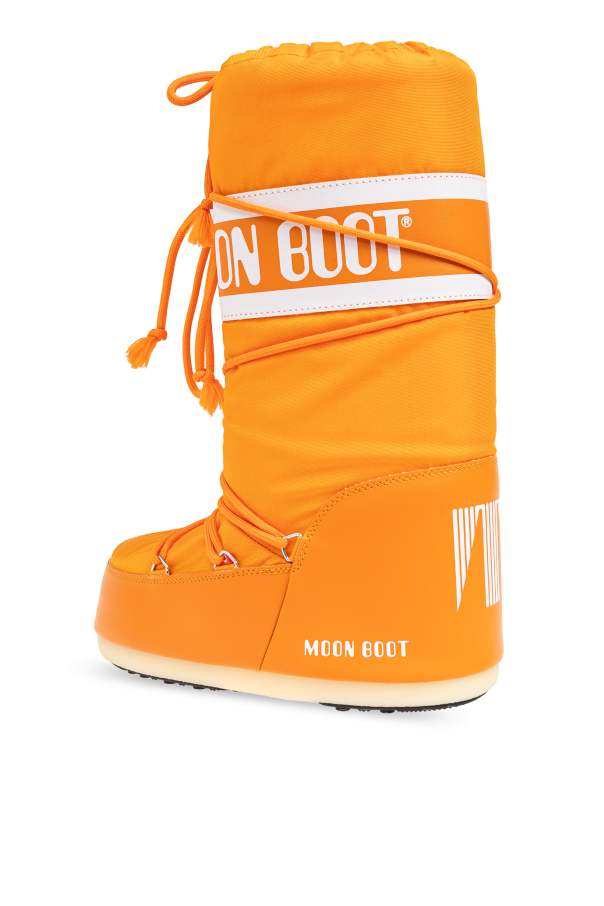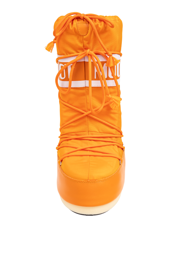 Elevate your winter wardrobe with the exclusive Icon Nylon Snow Boots from our luxe collection. Designed by the renowned Moon Boot, these women's snow boots are the epitome of contemporary elegance and functional style. Crafted with a high silhouette that extends above the ankle, these boots feature a wide shaft and a simple, monochromatic design. The exterior, likely composed of nylon with synthetic elements at the sole, ensures durability and weather resistance. The iconic "MOON BOOT" branding is prominently displayed on a broad white stripe at the top of the shaft, as well as along the side of the sole. A full-length lace-up closure allows for a customized fit, while integrated lacing elements and tassel-ended laces add a touch of sophistication. The flat, beige outsole guarantees comfort and stability, making these vibrant orange boots both practical and chic for snowy days. Why Choose This Product? Exclusive design by Moon Boot, a brand with a storied legacy since the 1970s. High silhouette and wide shaft for enhanced coverage and style. Durable nylon and synthetic construction for superior weather resistance. Full-length lacing for personalized fit and comfort. Bold, dynamic orange color for a standout look.