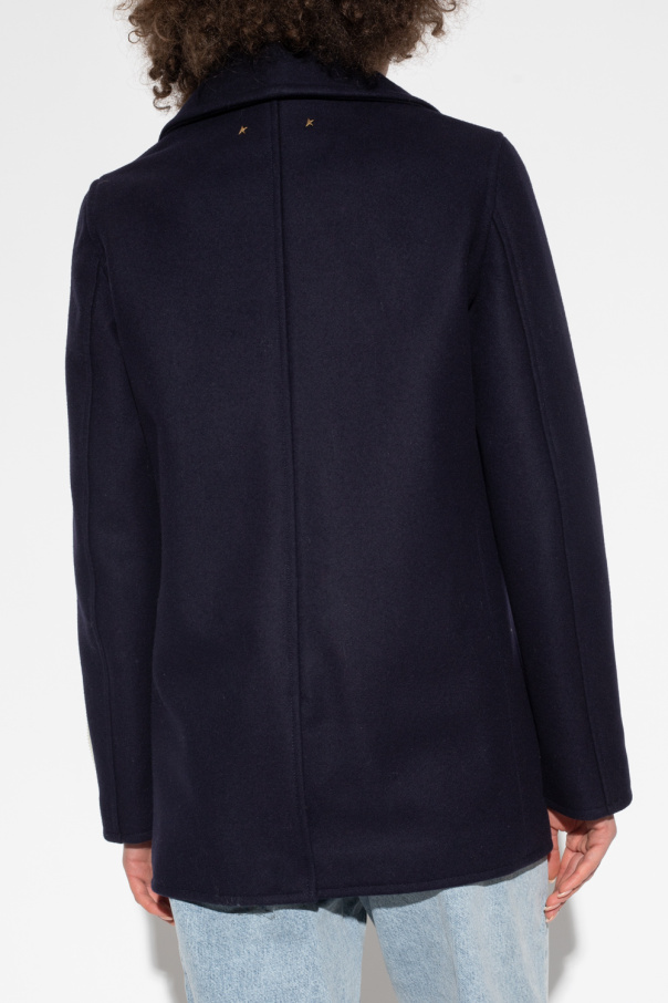 Navy blue coat from Golden Goose. Crafted from a virgin wool blend, this style features a cropped, double-breasted silhouette with antiqued gold-tone buttons, two slip pockets, a single back vent and long sleeves and a cream and red logo patch on the cuff.