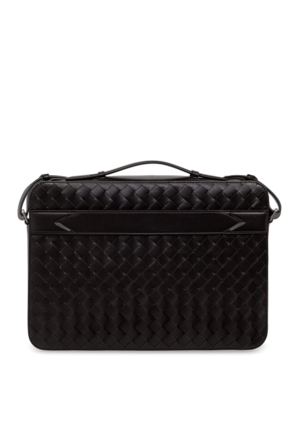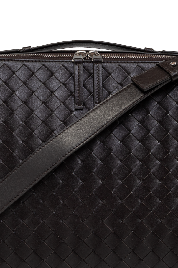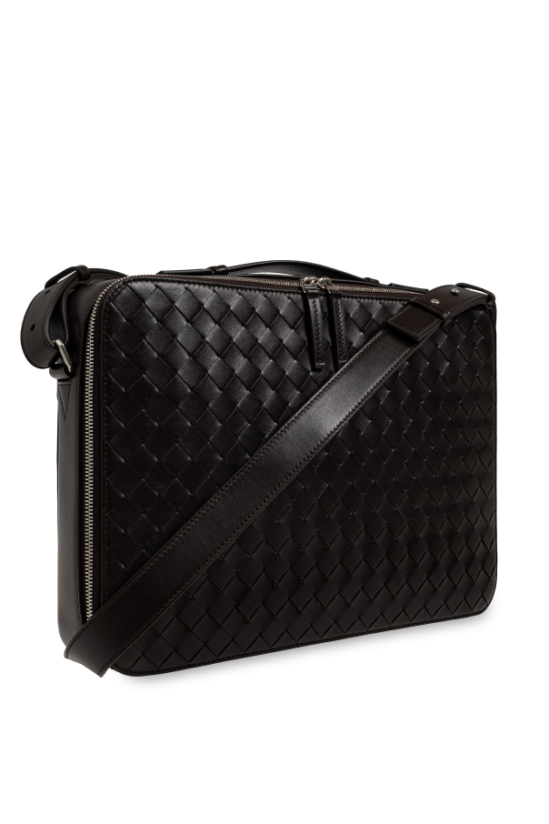Introducing the "Getaway" Leather Briefcase by Bottega Veneta, a paragon of sophistication and functionality for the discerning professional. Crafted from premium calfskin leather, this exquisite piece boasts the brand's iconic Intrecciato weave pattern, rendering a deep, rich brown hue that exudes luxury and timeless elegance. The "Getaway" is thoughtfully designed with a rectangular silhouette, featuring sharp, defined edges and a flat base allowing it to stand independently. Its construction includes a dual-zipper closure system, with a main zipper atop and an additional front zipper, facilitating effortless access to smaller essentials. The briefcase is adorned with silver or brushed steel hardware, enhancing its sophisticated appeal. For versatile carrying options, it includes a detachable, adjustable shoulder strap and a sleek top handle, offering comfort and convenience whether on daily commutes or shorter travels. The interior is lined with canvas, organized with a dedicated laptop compartment, two slip pockets, and a zippered pocket, ensuring all your belongings are neatly stored. Why buy this product? Elegant design with Bottega Veneta's signature Intrecciato pattern. High-quality calfskin leather and canvas interior. Practical and functional with multiple compartments and pockets. Versatile carrying options with a detachable shoulder strap and top handle. Discreet designer logo details, signifying exclusivity and luxury.