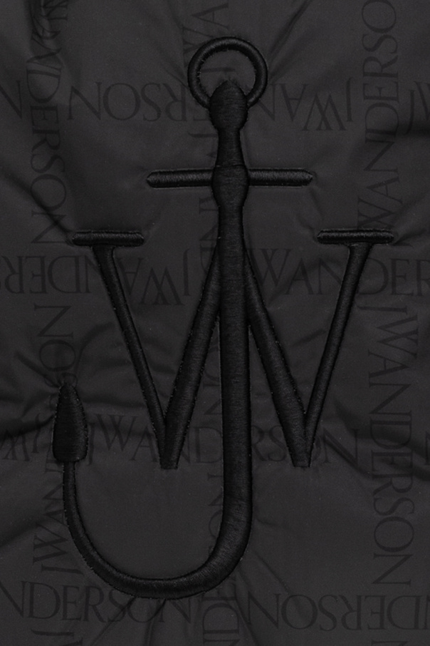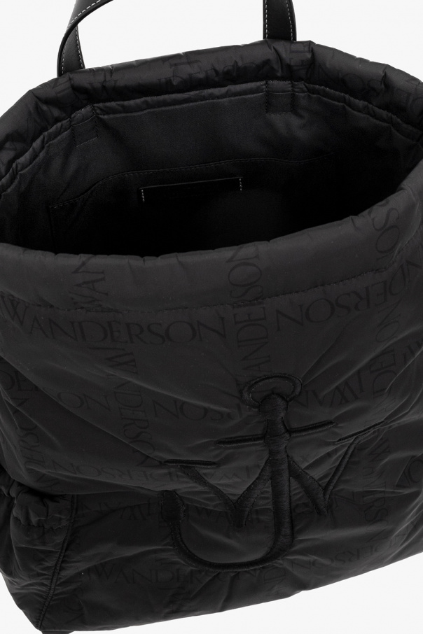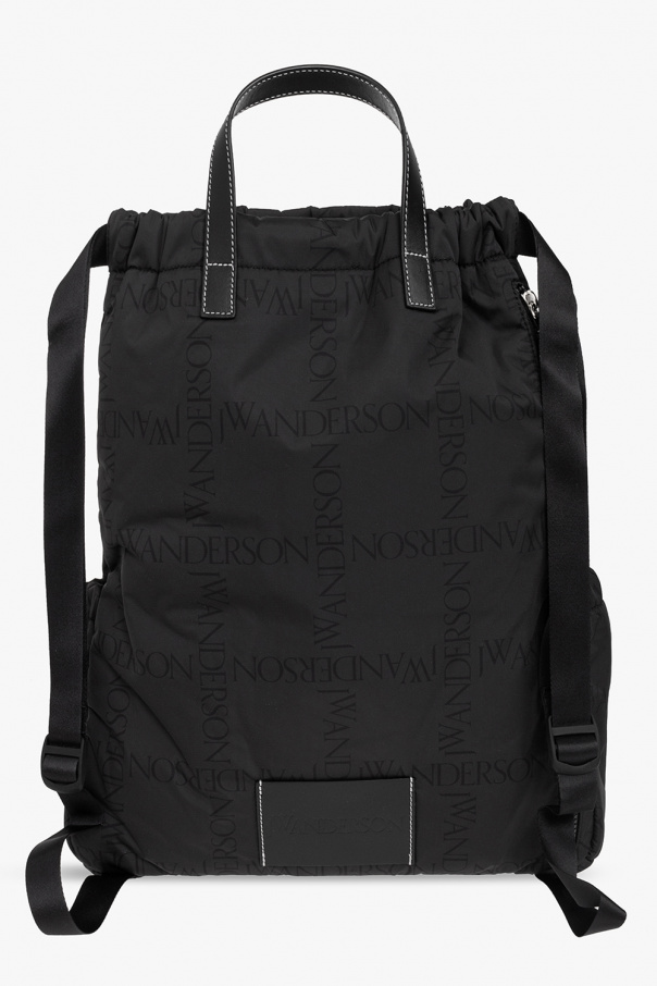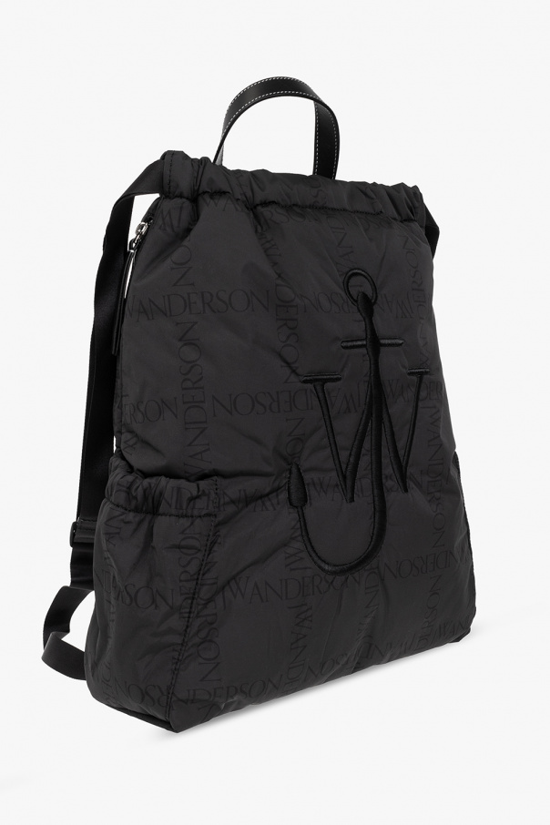 Black backpack from JW Anderson. Embellished with a logo pattern, this design features two side slip pockets, a half-round handle, adjustable shoulder straps and a drawstring interior with a slip pocket.
