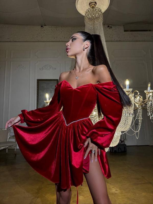 Зроблено в Україні?:Производство ,Материал:Бархат , Велюр ,Длина рукава:Длинный ,Силуэт:С открытыми плечами ,Особенности модели:С корсетом ,Особенности:Коктельное ,Сезон:Зима , Осень , Весна , Демисезон ,Принт:Без принта ,Длина:Мини ,Стиль:Вечерний , Праздничный ,Декор:Стразы , - Shipping