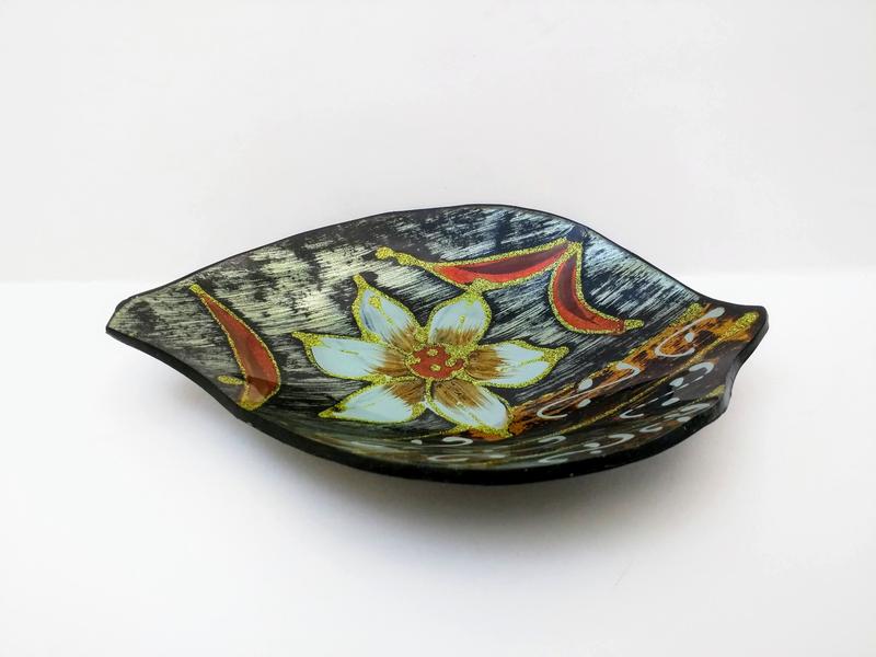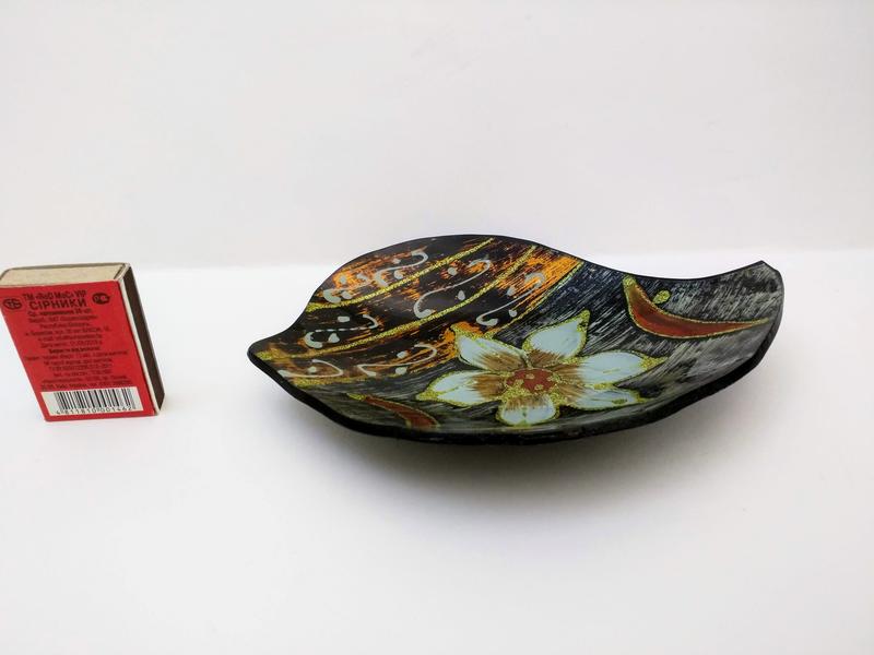 Из Англии. С витрины магазина. Без дефектов. Стекло. Снизу нанесён красивый рисунок, залито чёрным лаком. Верх гладкий можно мыть. На мягких пятках, снизу. Красиво блестит и переливается. Опуклая форма, как листок. Размер 18х12,5 см. Глубина 3 см. Можно использовать как пепельницу. Красивый подарок.