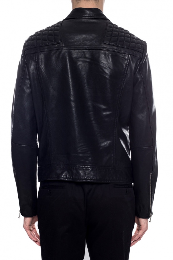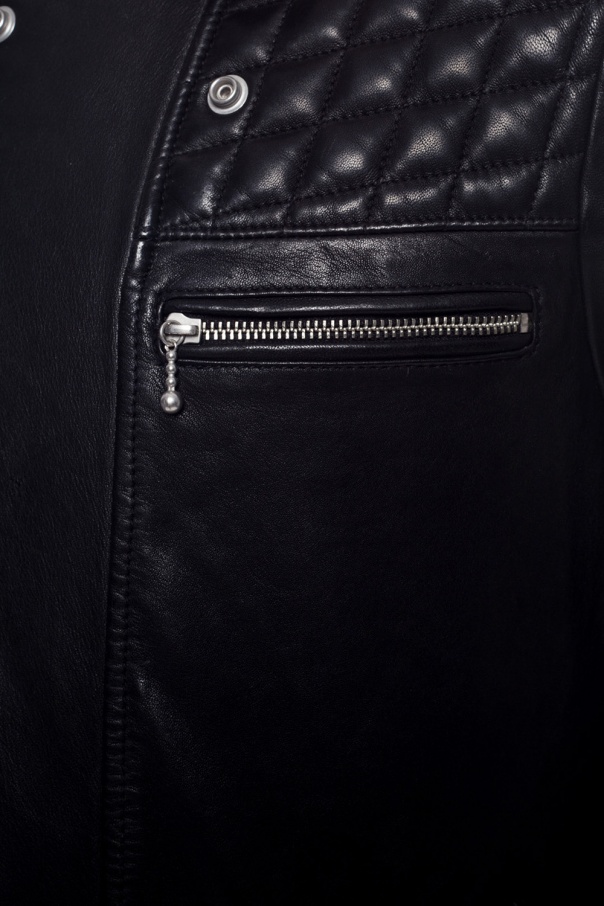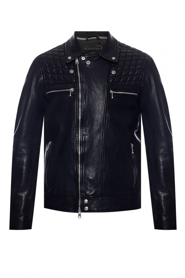 Black ‘Ronver’ jacket from AllSaints. Made of lamb leather. Fastened via two-way zip and snap-buttons. Embellished with quilted shoulder panels. Features four zipped pockets on the front.