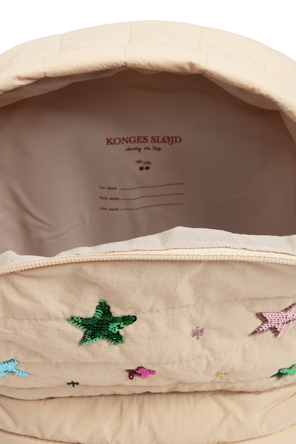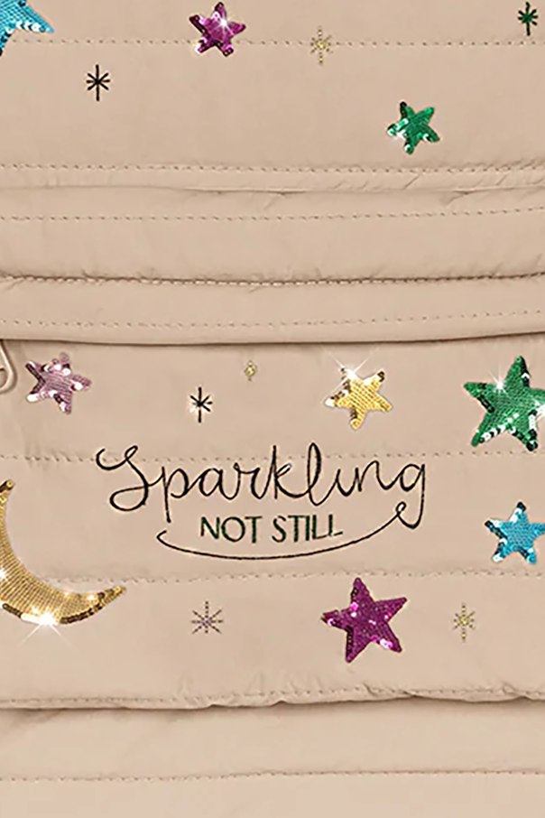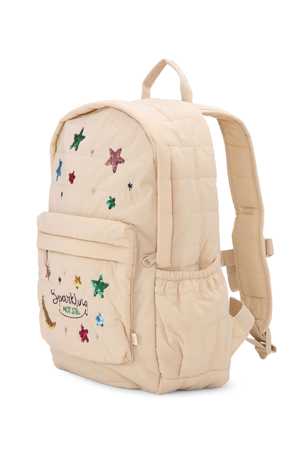 Discover the epitome of elegance and functionality with our exclusive quilted backpack for children by the renowned Danish brand, Konges Sløjd. This luxurious accessory seamlessly blends style and practicality, making it an ideal choice for your little one. Crafted from premium quilted nylon, this backpack boasts a classic rectangular shape with a rounded top. The bewitching design features colorful appliqués of stars and moons in vibrant shades of green, pink, blue, violet, and gold, adding a whimsical touch to its sophisticated beige exterior. The front pocket proudly displays the phrase "Sparkling not still," accompanied by a discreet designer label in the lower right corner. The backpack is equipped with a practical front zip pocket, a spacious main compartment, and a side pocket perfect for a water bottle. The interior is lined with durable polyester, ensuring longevity and ease of maintenance. The adjustable straps provide a comfortable fit, while the dual-zip closure offers secure storage, making it both water and wind-resistant. Why choose this product? Exquisite quilted design with colorful star and moon appliqués Durable and water-resistant nylon exterior Spacious and practical compartments for all essentials Comfortable adjustable straps Eco-friendly materials by Konges Sløjd, a leader in sustainable children's fashion