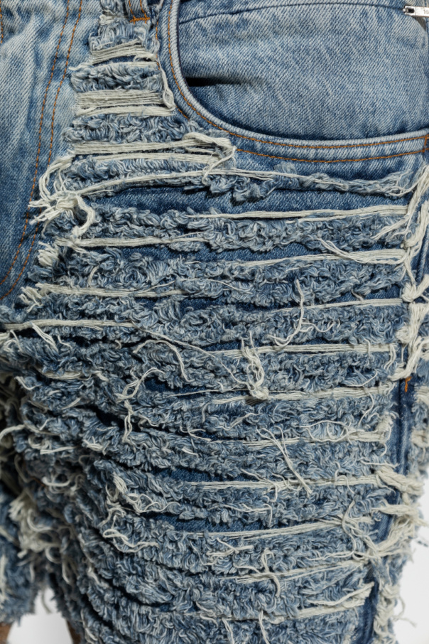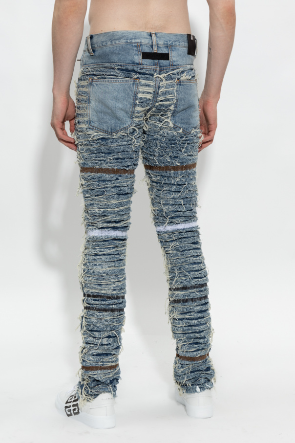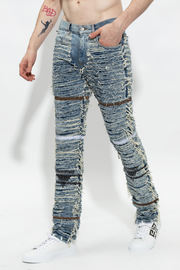 Blue and cream jeans with a vintage effect from 1017 ALYX 9SM x Blackmeans. Fastened with a zip and button, this straight leg pair features brown, black and white stitching details, logo patch at the back, four slip pockets, two pockets with concealed zips and straight legs.