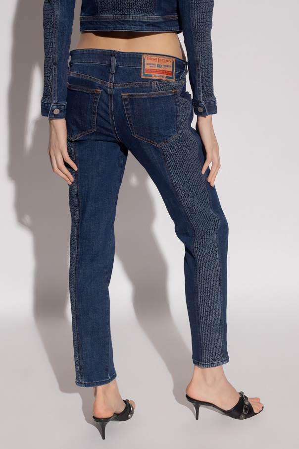 Navy ‘D-Vision’ skinny jeans from Diesel. Made of cotton from sustainable farms, this pair features a decorative silver-tone zip, vertical gathers, four slip pockets, two zip pockets and logo patch at the back in beige, red and blue.