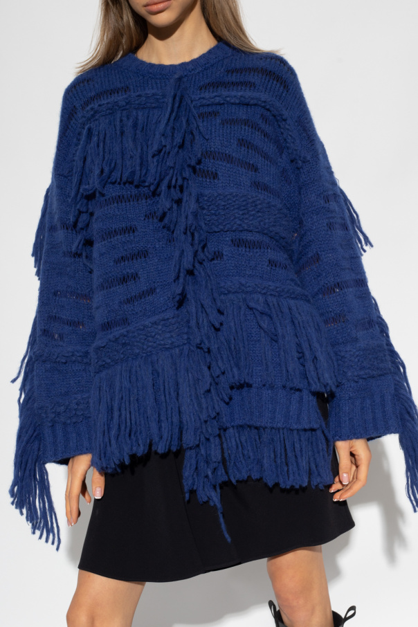 Blue loose-fitting knitted sweater from Stella McCartney. This long sleeve design features decorative holes, fringes, side slits, round neck and long sleeves.