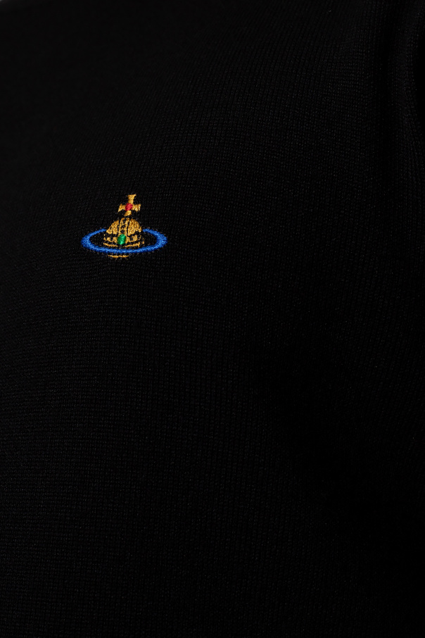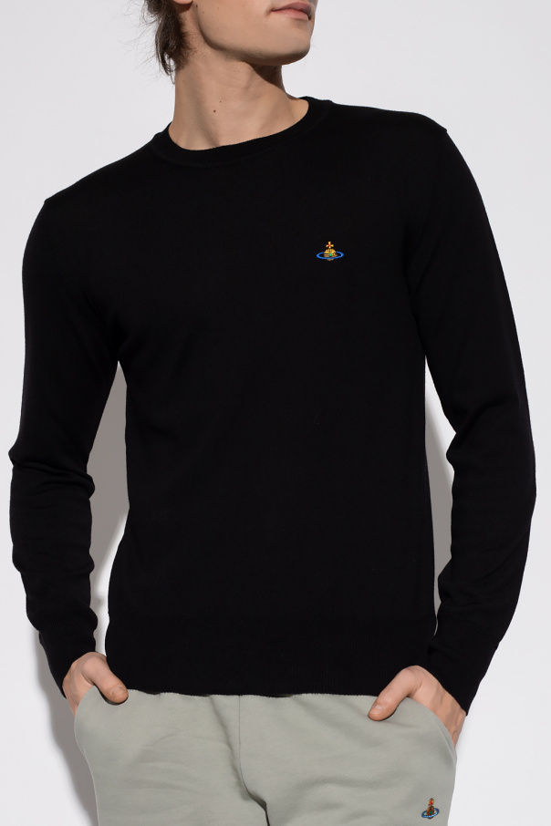 Black crewneck sweater from Vivienne Westwood. Crafted from wool, this style features an embroidered logo on the front and ribbed trims on the collar, bottom hem and cuffs.