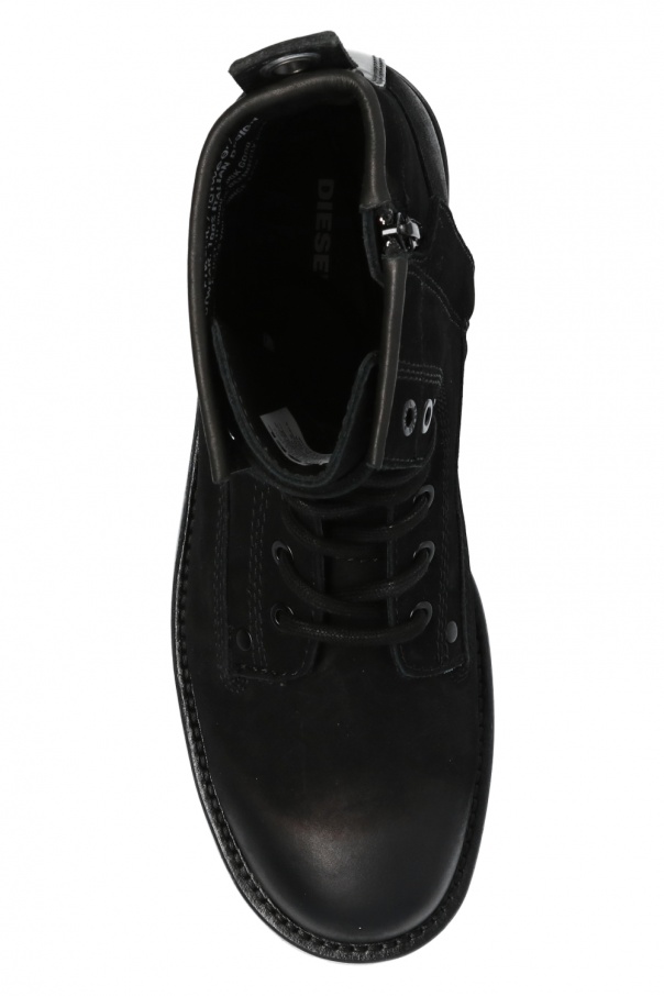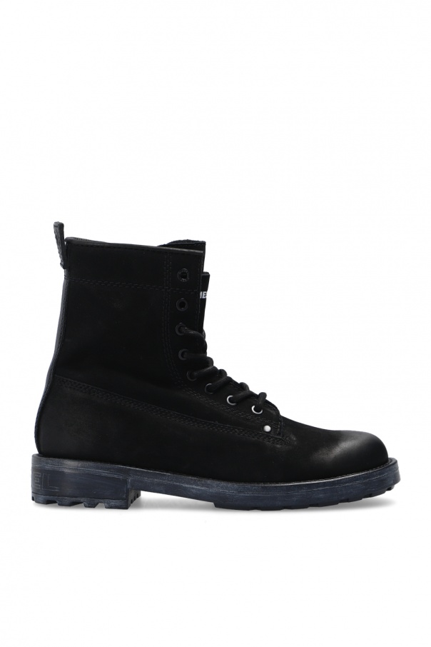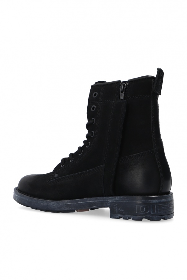 Black ‘D-Throuper’ ankle boots from Diesel. Crafted from cow leather, this pair fastens with a side zip and is complete with a white logo print, a pull strap with a logo at the heel and a rubber sole in black and white.
