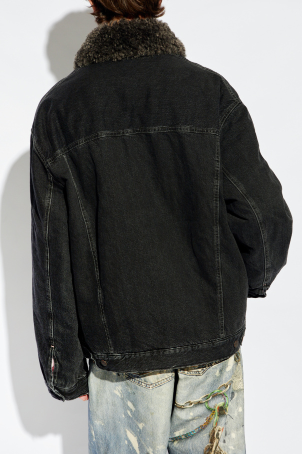 Introducing an epitome of sartorial elegance and versatility, the Black Denim Jacket with a Fur Collar by Acne Studios. Crafted with precision, this jacket harmonizes the ruggedness of thick denim with the luxe touch of a fur collar, presenting a garment that transcends conventional denim wear. The jacket's pure cotton exterior is tailored to perfection, featuring a sophisticated black hue that dominates its appearance. Its design is accentuated with distinctive metal buttons that not only serve as a functional element for closure but also add a contrasting aesthetic against the dark backdrop. These buttons, embossed with the logo or name of the brand, underscore the jacket's exclusive origin. Functionality meets style with its four pockets - two flap pockets at the chest and two side pockets, providing ample space for essentials. The fur collar, a detachable masterpiece, offers versatility and an added layer of warmth, making it an exquisite addition to the jacket. Subtle yet significant, the interior of the cuffs reveals a hint of pink, a nod to the meticulous attention to detail that Acne Studios is renowned for. Why Purchase This Product? Exclusive Design: A unique blend of classic denim and luxurious fur collar sets this jacket apart. Versatile Functionality: Equipped with practical pockets and detachable collar for various styling options. Exceptional Quality: Made from 100% cotton with a polyester lining, ensuring durability and comfort. Attention to Detail: Contrasting metal buttons and pink cuff linings highlight the brand's commitment to elegance.