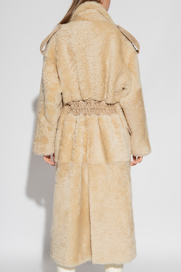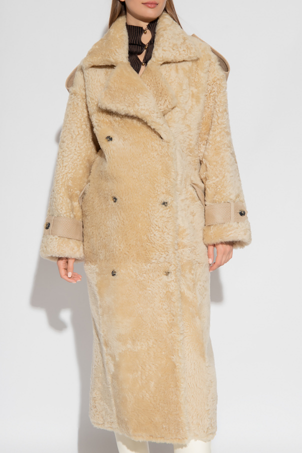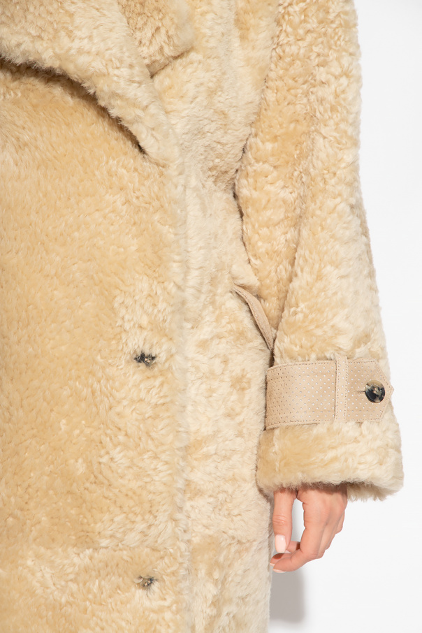 Beige ‘Jordan’ double-breasted shearling jacket from The Mannei. Made of sheepskin, this garment features button fastenings, two flap pockets, notch lapels, single rear vent and elasticated panel at the back.