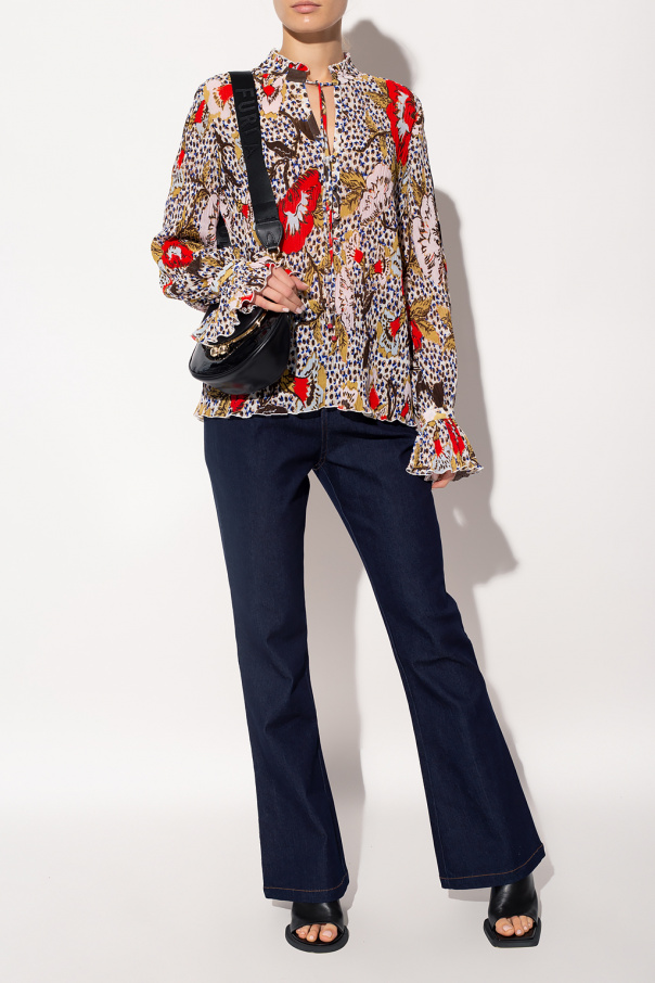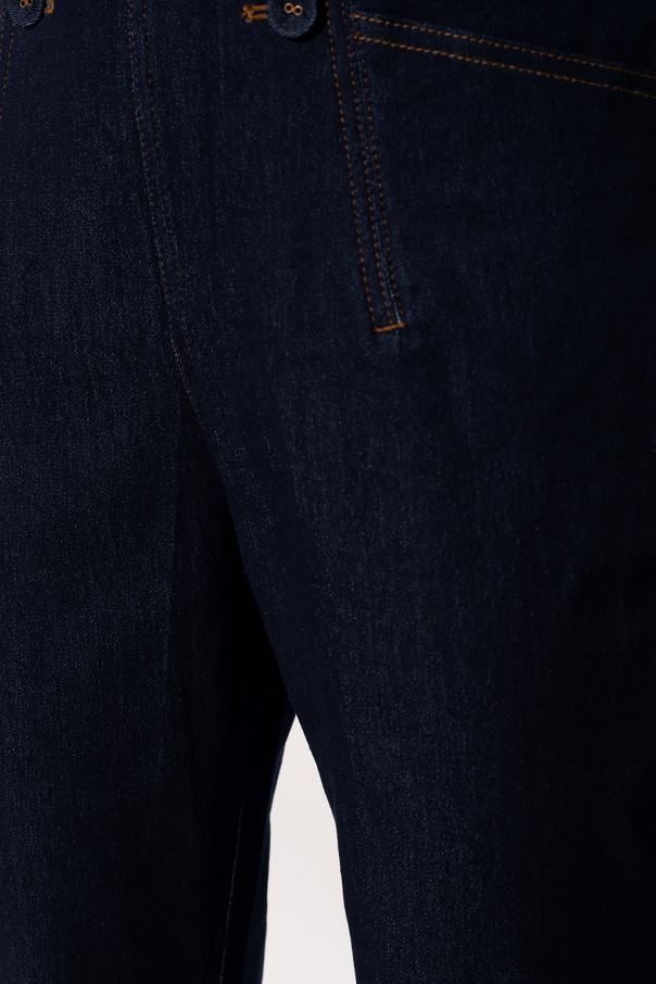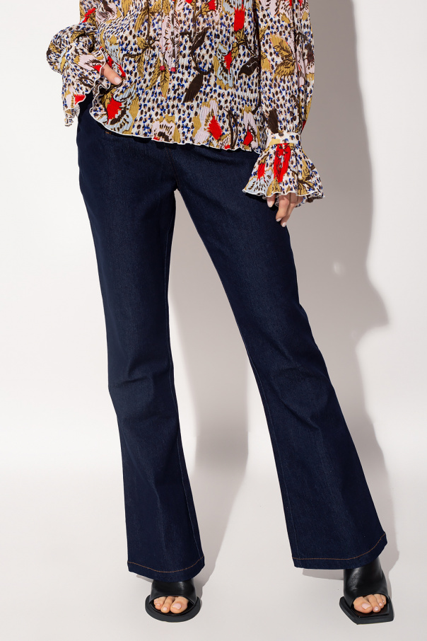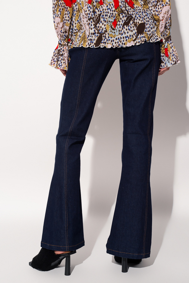 Navy blue jeans from Diane Von Furstenberg. Cut with a high-waisted silhouette, this pair falls down with flared legs and features a zip fly with a button, two front slip pockets and contrasting orange stitching.