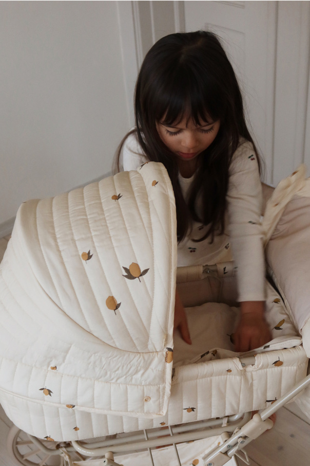 Cream and beige doll pram with a vintage effect from Konges Slojd. Designed with four large wheels made in EVA material for extra stability. Features quilted printed fabric and a mattress made in 100 percent organic cotton. Designed with a softly cushioned storage basket under the lift. The frame is made of metal with spongy soft handles.