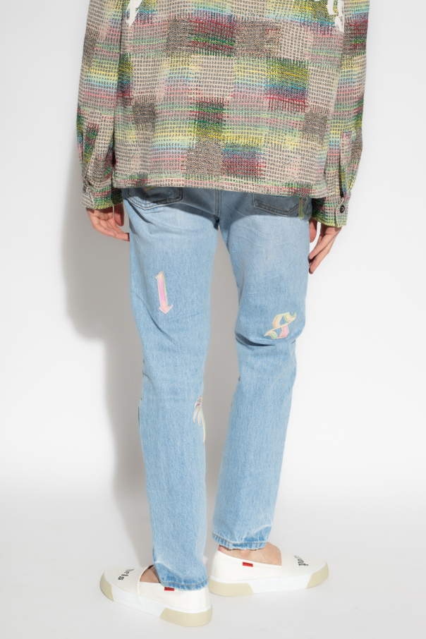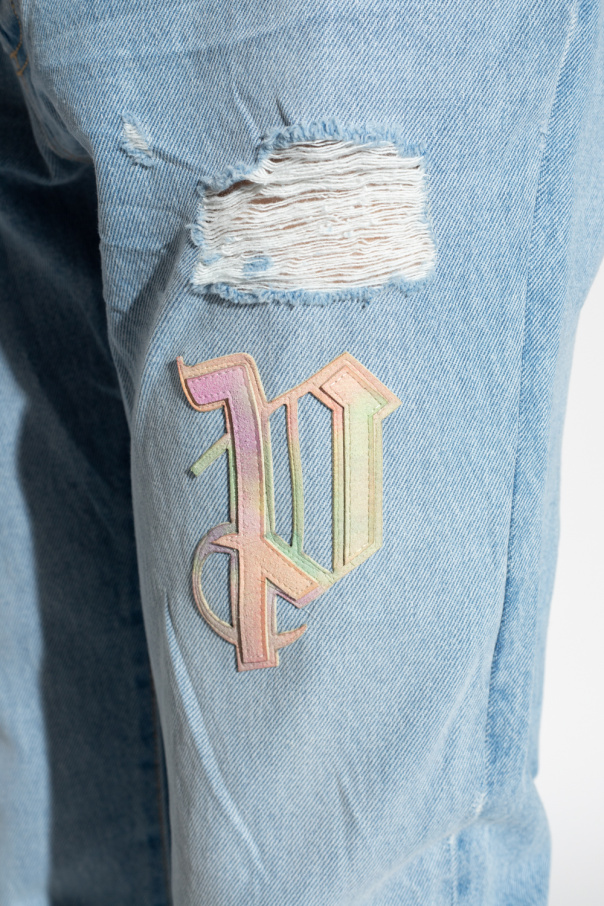 Blue jeans from Palm Angels. Crafted from cotton, this tapered leg pair features button fastenings, patches, vintage effect, five slip pockets, logo patch at the back and tapered legs.