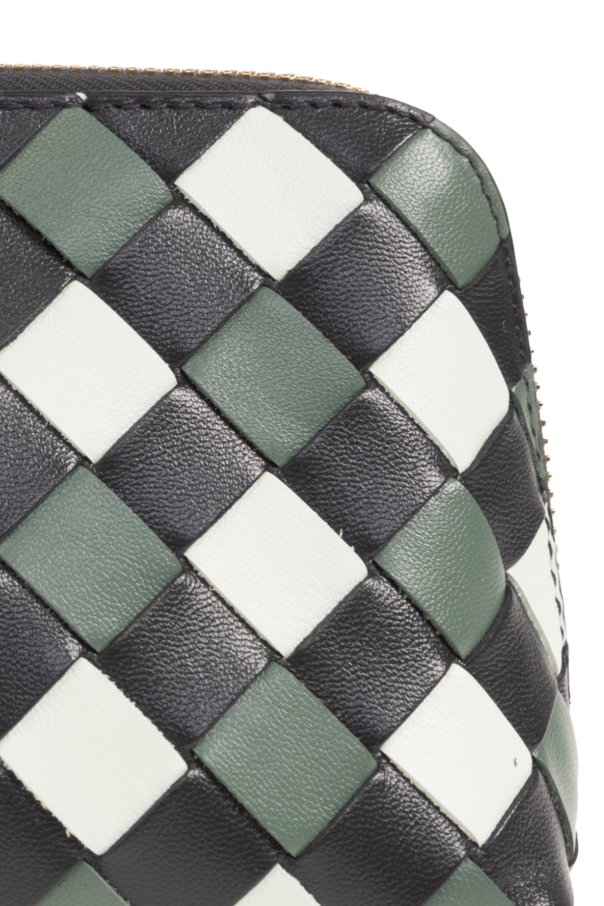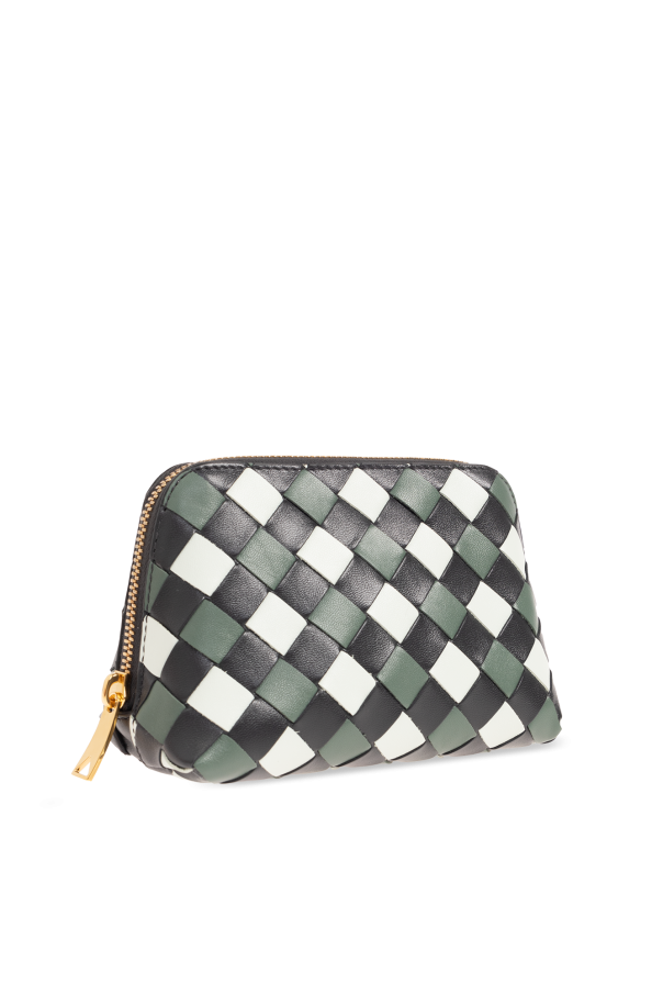 Black, green and white wash bag from Bottega Veneta. Made of the brand’s signature Intrecciato leather, this model features a zip fastening, gold-tone metal hardware and one internal compartment with one slip pocket.