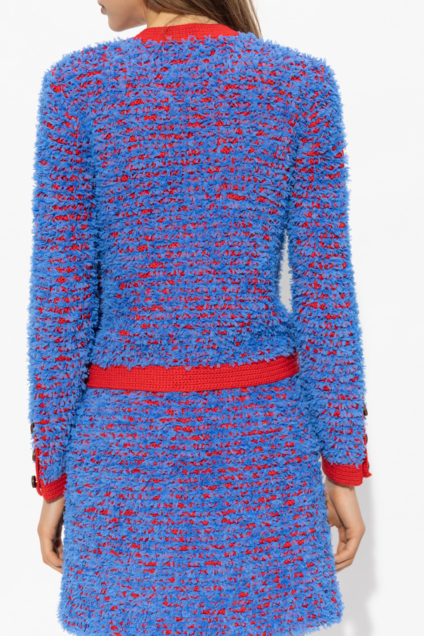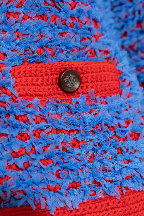 Blue and red 'Kendra' cardigan from Tory Burch. Crafted from a cotton blend with a confetti-like tweed texture throughout, this style features a round neck, button closures and long sleeves with button cuffs.