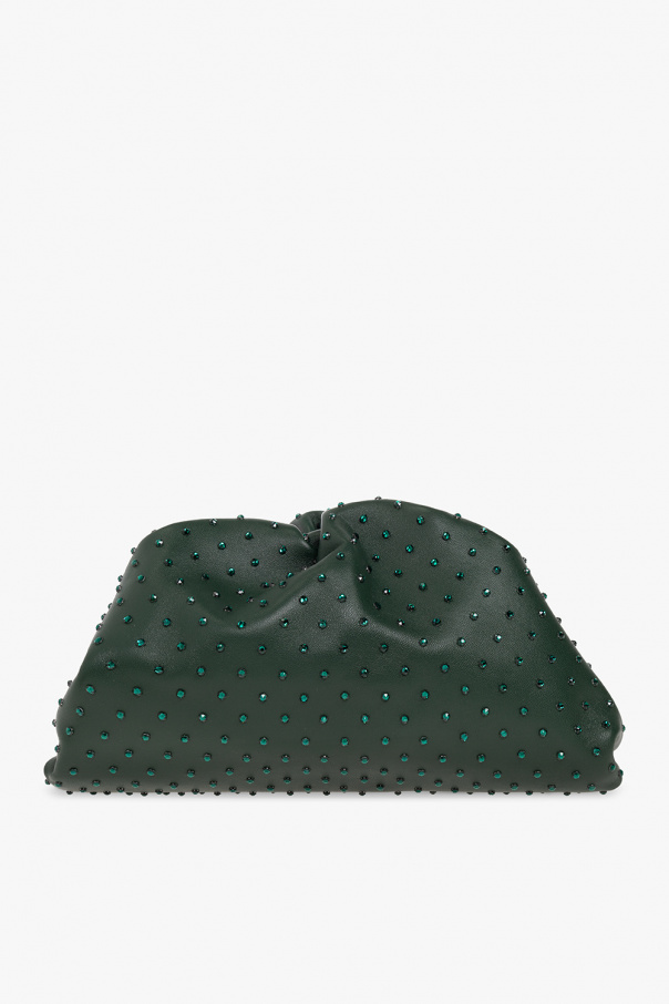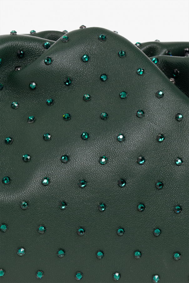Dark green ‘Pouch Teen’ handbag from Bottega Veneta. Crafted from lamb leather, this design secures with a magnetic fastener and showcases gathered details and all-over glossy crystals. It is complete with silver-tone metal hardware and one internal compartment.