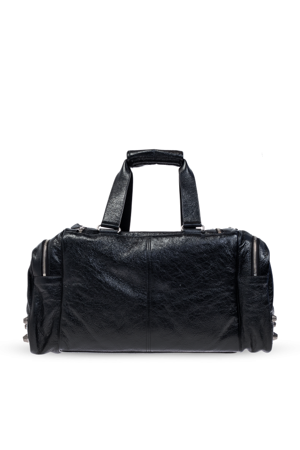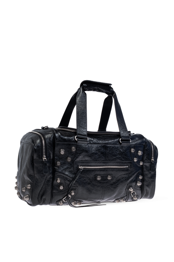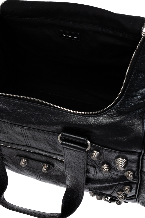 Introducing the ‘Le Cagole’ handbag by Balenciaga, a paragon of luxury and versatility encapsulated in a compact design. Crafted from premium sheepskin leather, this exquisite accessory boasts a tactile texture that exudes sophistication and durability. Its rectangular silhouette with rounded corners and a supple structure speaks to a modern aesthetic, offering flexibility and ease of use. The handbag’s allure is heightened by its absence of patterns, presenting a timeless, monochromatic black that seamlessly integrates into any wardrobe. Accentuated with an array of metallic details – including studs and hardware along the edges and pockets – it introduces an edgy, rock-inspired flair to its classic demeanor. A discernible designer logo on the lining affirms its authenticity and high fashion pedigree. Functionality is at the core of ‘Le Cagole’. Equipped with short handles for handheld carrying and an adjustable, long strap for over-the-shoulder or crossbody wear, it adapts to various styles and occasions. The main compartment, secured with a zipper, ensures the safekeeping of belongings, while an external zippered pocket and internal compartments enhance its practicality, making essentials readily accessible. Why Purchase This Product? Luxurious sheepskin leather construction with a textured finish. Timeless design enriched with bold, metallic accents. Adjustable carrying options for unparalleled versatility. Secured storage with a zippered main compartment and three additional zippered pockets. Signature Balenciaga craftsmanship and authenticity.