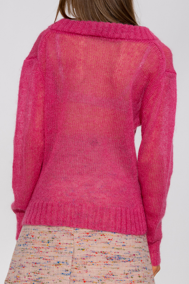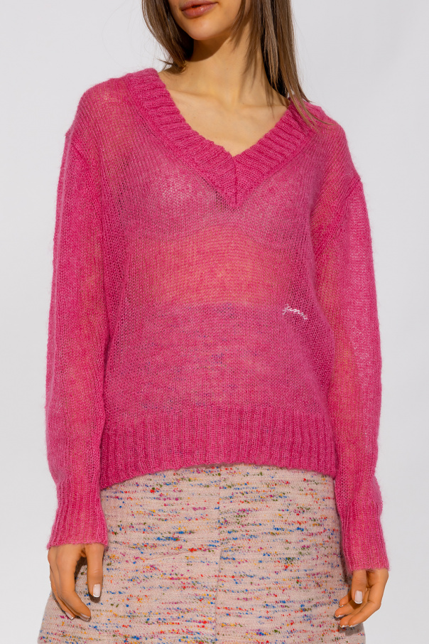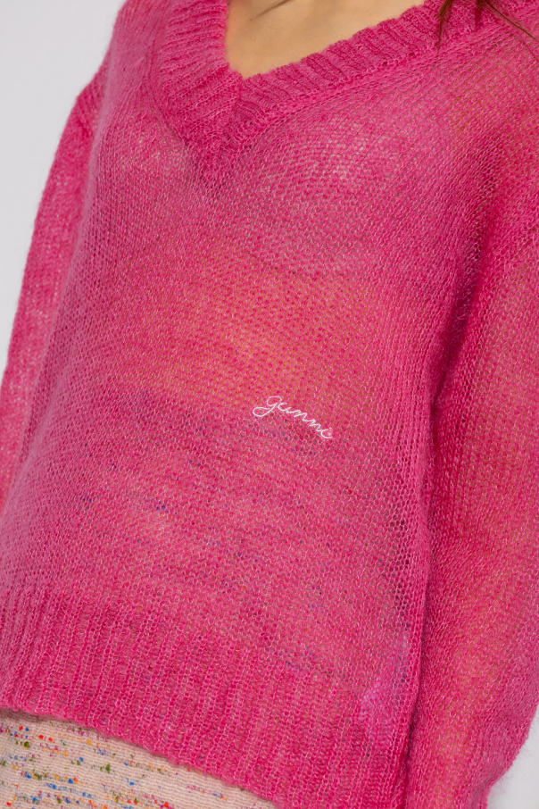 Pink sheer sweater from Ganni. Crafted from a mohair and wool blend, this garment is enriched by a white logo embroidery and ribbed trims at the neck, hem and cuffs.
