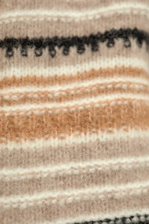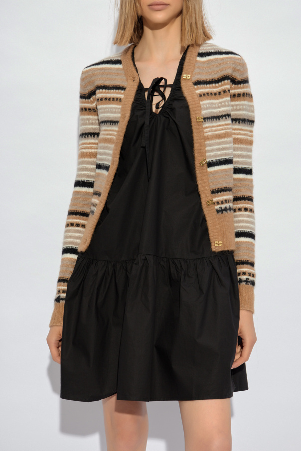 Introducing the Striped Pattern Cardigan by Ganni, a masterful blend of elegance and comfort. This exquisite piece showcases a harmonious balance of beige, black, and white stripes, rendered in a soft, plush fabric that suggests the use of wool or a luxurious wool blend, possibly even cashmere, given its characteristic texture and sheen. The cardigan commands attention with its long sleeves and front button closure, featuring buttons in a striking gold hue that adds an extra touch of sophistication. The designer's logo, discreetly placed on the lower left side, melds seamlessly with the cardigan's overall aesthetic, ensuring the pattern remains the focal point. Every aspect of this cardigan, from its varied stripe widths to the subtle incorporation of intricate patterns and lines within its weave, contributes to a depth of design that is both visually appealing and sophisticated. The quality of the material is evident, showcasing a high standard of craftsmanship with smooth color transitions and a tactile appeal that promises not only style but also unparalleled comfort. Why Purchase This Product? Elegant design with a timeless striped pattern in a chic color palette. Luxurious blend of 32% Wool, 32% Alpaca, 30% Polyamide, and 6% Elastane, offering both warmth and durability. Gold-toned button details for a touch of refined glamour. Exquisite craftsmanship from renowned designer Ganni, known for their commitment to quality and style. Versatile wearability, seamlessly transitioning from casual to formal settings.