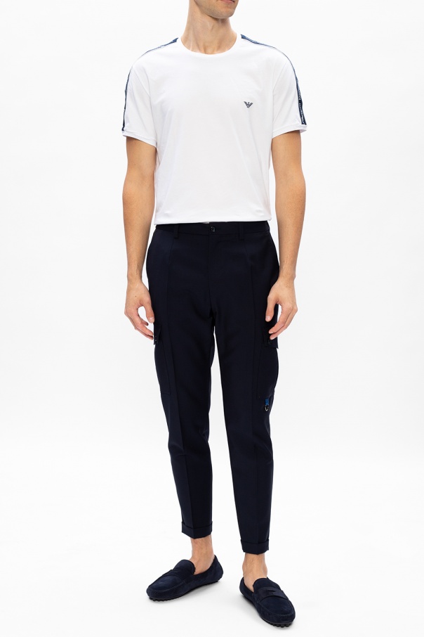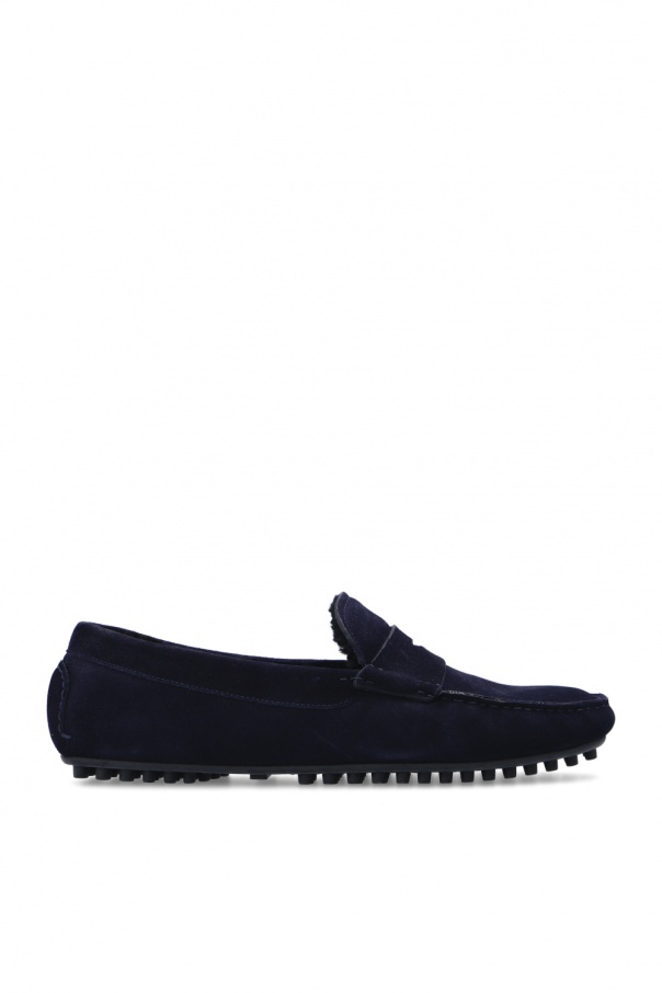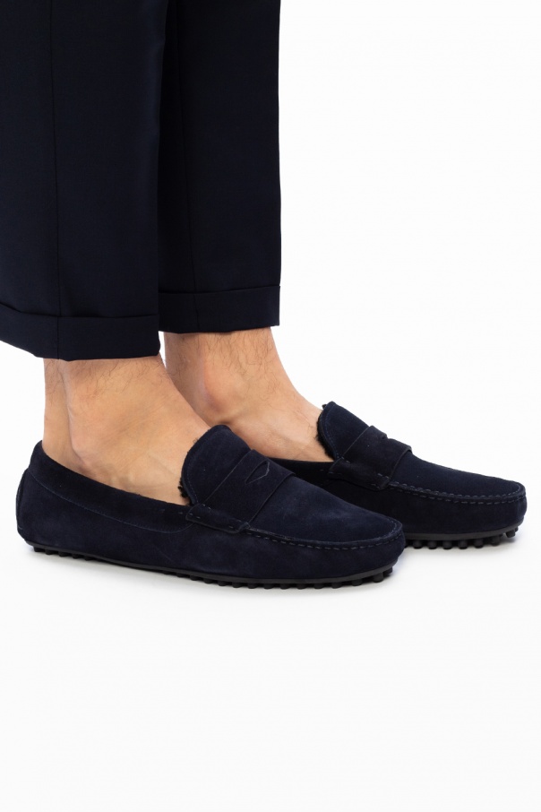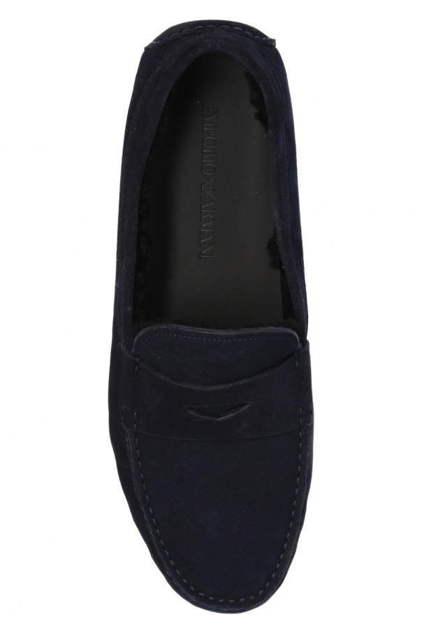 Navy moccasins from Emporio Armani. Crafted from suede trimmed with faux fur, they are complete with distinct stitching details and a black rubber sole.