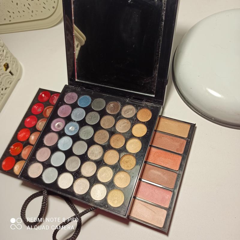 годно до середины2023года помады тени хайлайтер румяна,покупала за 580грн,огромное зеркало,есть ручки ,закрывается как квадратик