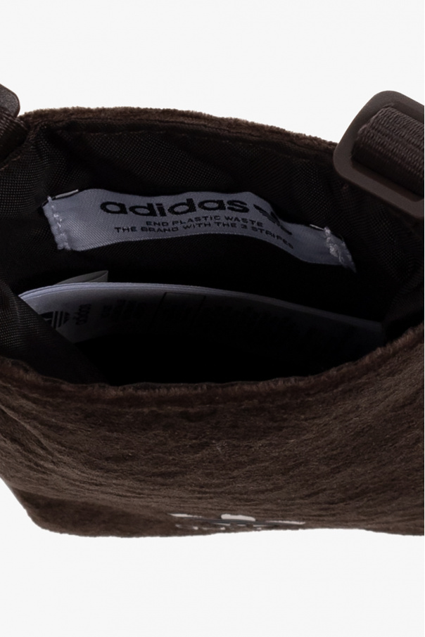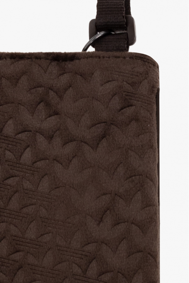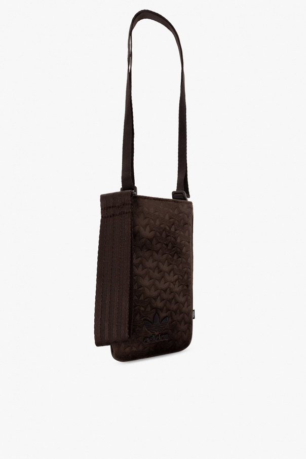 Brown phone pouch from ADIDAS Originals. This item features a logo detail, monogram pattern, adjustable strap, wide stripe with the brand’s signature three stripes and one internal compartment.