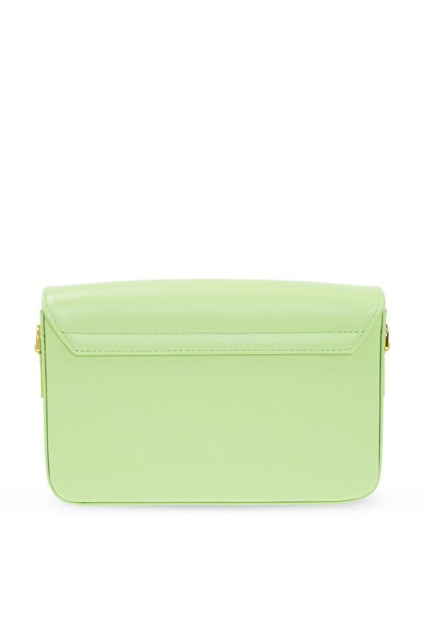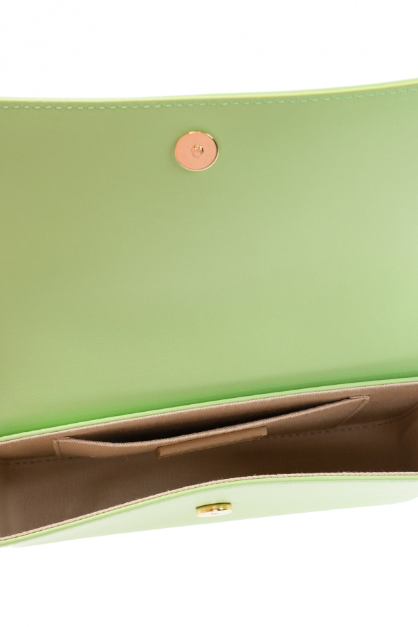Light green ‘Le Carinu’ hand bag from Jacquemus. Crafted from leather, this model features a flap with a magnetic snap closure, metal logo, detachable hand strap with a light green and black snap-fastened pocket, gold-tone metal hardware and one internal compartment with one slip pocket.