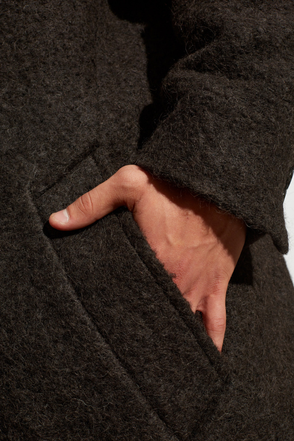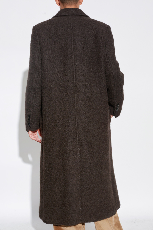 Introducing the Double-Breasted Men's Overcoat from the esteemed Parisian brand AMI Alexandre Mattiussi. This exquisite garment exudes timeless elegance and sophistication, crafted to perfection for the discerning gentleman. With a classic double-breasted design, this long overcoat extends gracefully below the knees, offering a distinguished silhouette. The rich, brown hue underscores its refined aesthetic, while the absence of patterns ensures a clean and polished look. The coat features dark buttons, meticulously crafted from either high-quality plastic or metal, adding a touch of understated luxury. The overcoat is made from an opulent blend of materials, including Alpaca, Cotton, Polyamide, Wool, and Silk. This composition promises not only exceptional warmth for cooler days but also a sumptuous feel against the skin. The wide, traditional collar enhances the coat's classic appeal, making it an indispensable addition to any stylish wardrobe. Practicality meets elegance with two side pockets, providing both convenience and a sleek finish. As seen on our model, the coat offers a flattering fit, embodying the effortless Parisian charm for which AMI is renowned. Why You Should Buy This Product: Timeless Design: A double-breasted overcoat that never goes out of style. Luxurious Materials: Made from a premium blend of Alpaca, Cotton, Polyamide, Wool, and Silk. Exceptional Warmth: Ideal for cooler days, ensuring you stay warm and stylish. Elegant Detailing: Dark buttons and a wide collar add a touch of sophistication. Practical Features: Two side pockets for added convenience. Prestigious Brand: Designed by AMI Alexandre Mattiussi, embodying Parisian elegance and craftsmanship.
