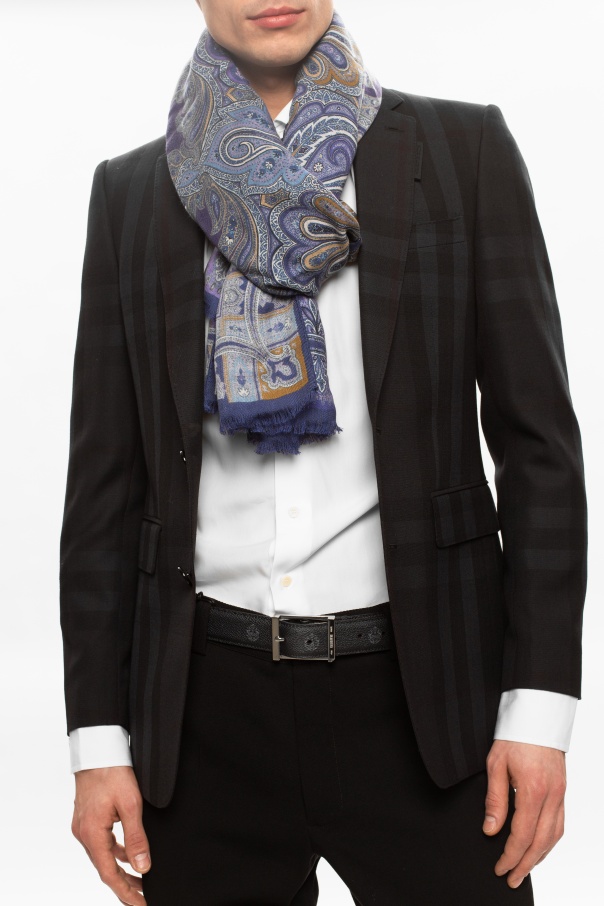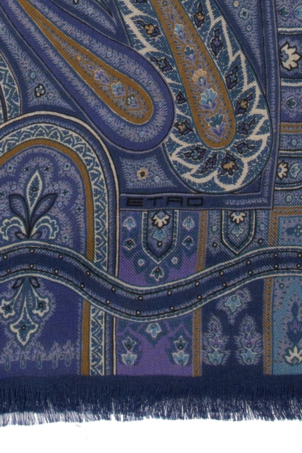 Navy blue, beige and green scarf from Etro. Crafted from wool and silk blend, this item showcases a floral pattern and frayed ends.