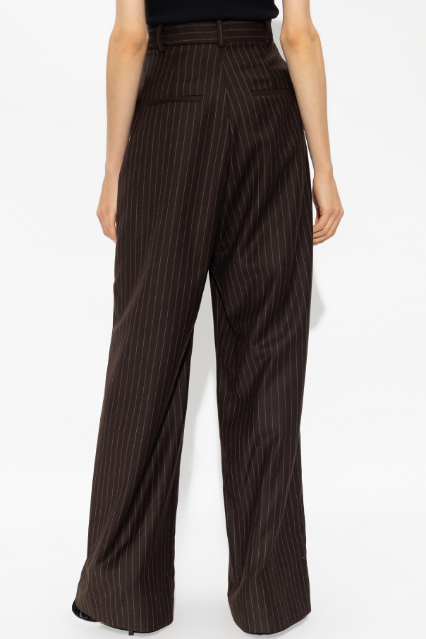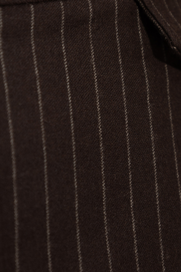 Dark brown ‘Jafr’ pleat-front trousers from The Mannei. Made of wool, this high-waisted pair features a hook, button and zip fastening, pinstripe pattern, four slip pocket, decorative buttoned flap pockets and wide legs.