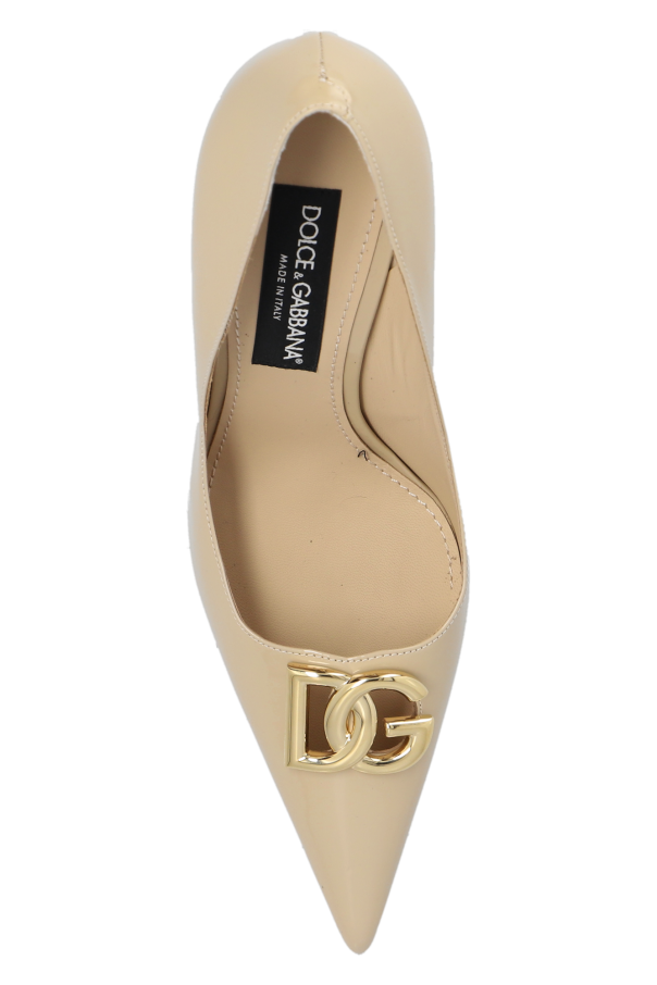 Light beige pumps from Dolce & Gabbana. Made of patent calf leather, this pair features a metal logo detail in gold-tone, a pointed toe and leather sole in dark brown.