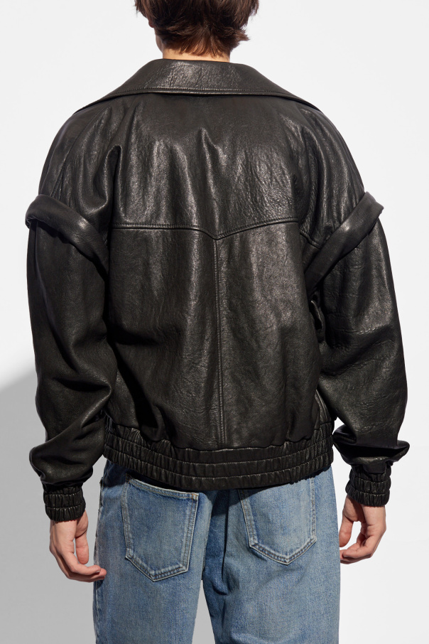 Black jacket with a stand collar from Saint Laurent. Made from lamb leather, this style fastens via a zip and showcases an embroidered logo, two frontal pockets, long sleeves and elasticized trims on the bottom hem and cuffs.