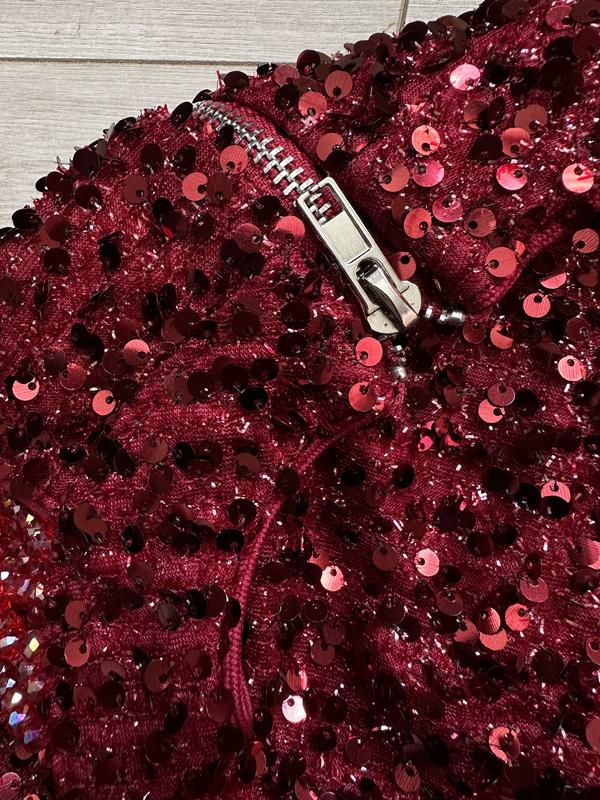 Драпированные бретели, украшенные бисером, придают этому элегантному платью эффект открытого плеча. Вечернее макси-платье, расшитое тысячами сверкающих пайеток, имеет высокий круглый вырез, приталенный силуэт, подчеркивающий ваши изгибы, и подол «рыбий хвост». Он идеально подходит для любого официального случая или особого мероприятия. Великолепный бордовый/винно-красный цвет. Размер указан м. Состояние новое. Замеры на фото.