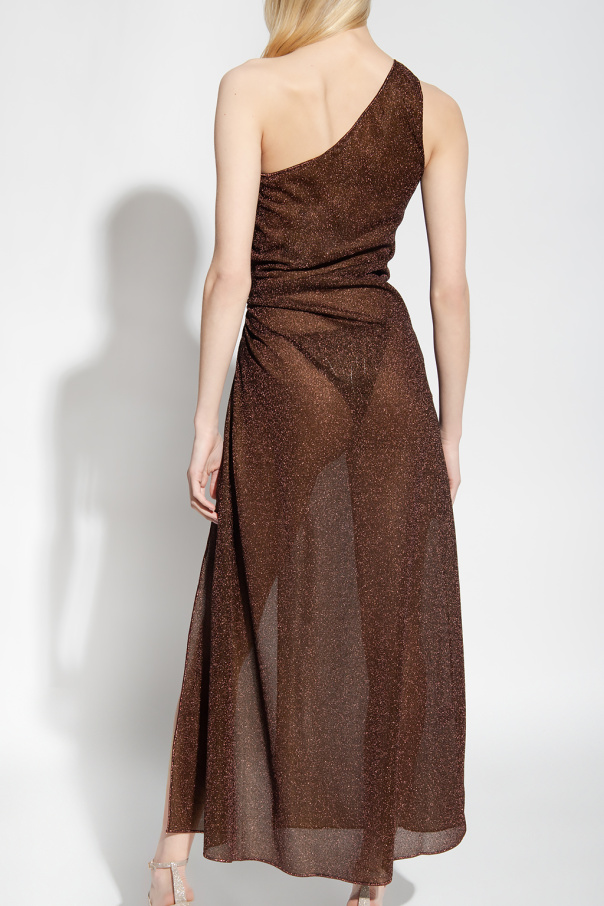 Brown one-shoulder dress from Oseree. Spruced up with glitter, this style features a decorative ring insert and a bottom slit.