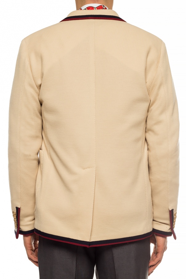 Beige blazer from Gucci. Made of wool and cotton blend. Fastened via decorative gold-tone buttons. Embellished with a navy blue logo patch. Features 3 slip pockets on the front and navy blue and red ‘Web’ piping.