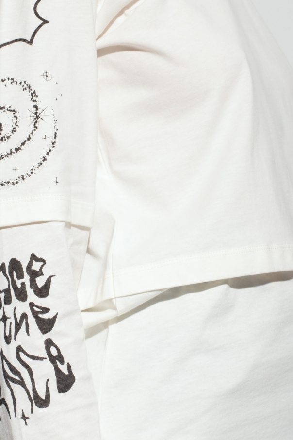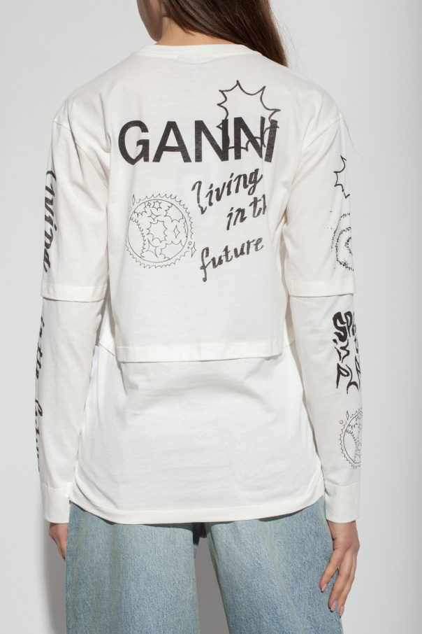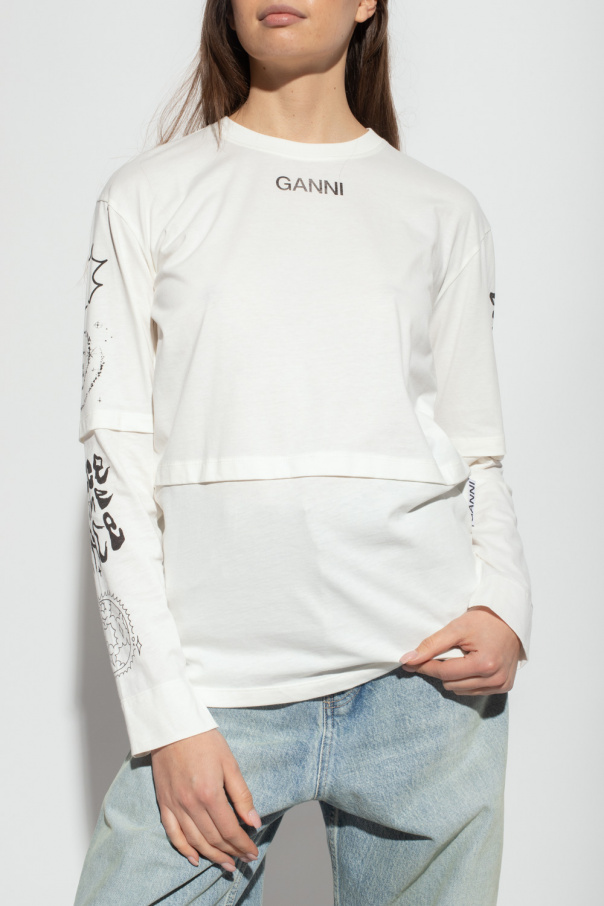 White T-shirt from Ganni. Made of organic cotton, this long sleeve design features dark grey prints, a logo insert on the side and a ribbed round neck.