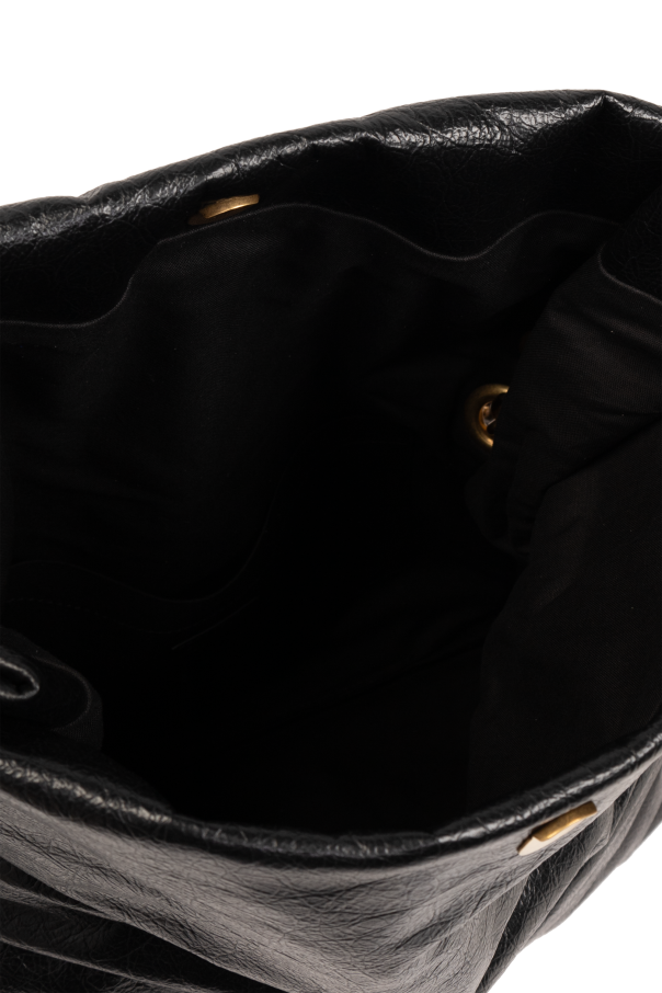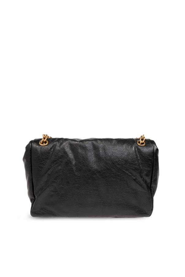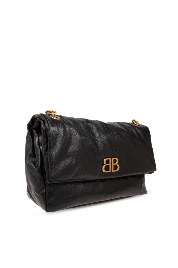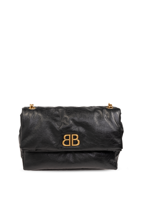Introducing the "Monaco M" shoulder bag by Balenciaga, a quintessence of elegance intertwined with functionality. Crafted from premium, supple, black leather-like material, this exquisite accessory exudes a slightly nonchalant charm with its distinctive, relaxed creases. Its allure is further accentuated by the luxurious golden accents, including the designer's iconic double "B" logo on the front flap, making it an emblem of sophistication and brand recognition. The bag's handle, an intricately woven golden chain, adds a touch of refinement and contrasts beautifully against the bag's black material, elevating its overall aesthetic appeal. Its flap closure, secured with a magnetic snap, offers both easy access and security for your belongings. The interior, lined in black fabric, is spacious enough to accommodate a plethora of items, making it not only stylish but also practical for everyday use. The golden metallic fittings, such as eyelets on the handle, maintain a cohesive style narrative. Presented in a lifestyle context, the "Monaco M" shoulder bag pairs effortlessly with casual and chic ensembles alike, from jeans to high heels, showcasing its versatility and how it can complement various outfits. Its elegant structure, combined with striking metal elements, positions this bag as a splendid addition to any wardrobe. Why Purchase the "Monaco M" Shoulder Bag? Elegance and functionality blended in a high-quality, soft, black leather-like material. Signature golden accents and Balenciaga's iconic logo add a distinguished touch of luxury. Secure magnetic snap closure and a spacious interior with a slip pocket for organized storage. Versatile design that complements a wide range of outfits, enhancing your everyday style.