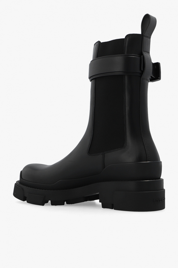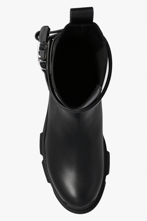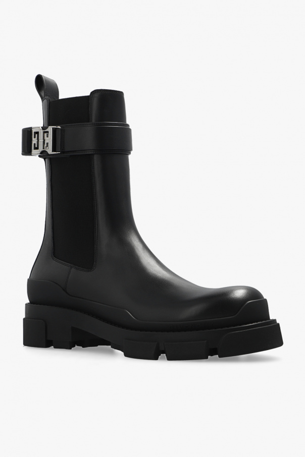 Black ‘Terra’ ankle boots from Givenchy. Crafted from calf leather, this model sits on a black rubber sole and showcases a buckle strap with a silver-tone ‘4G’ buckle and elastic panels on the sides.