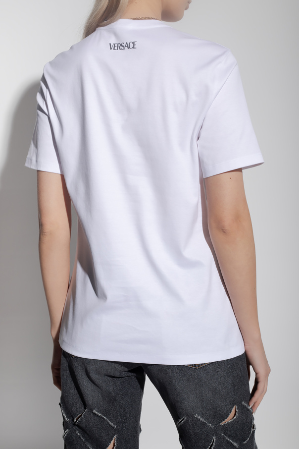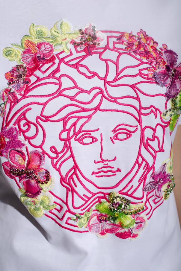 White crewneck T-shirt from Versace. Made of cotton, this style features short sleeves, an elasticated collar and pink graphic embroidery with the brand's signature Medusa, spruced up with a colourful floral motif and sequinned appliqués.