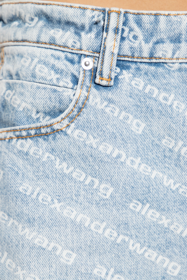 Light blue denim shorts from Alexander Wang. Fastened with a zip and button, this pair features a white logo pattern, three front pockets, two back pockets and raw cut edges.