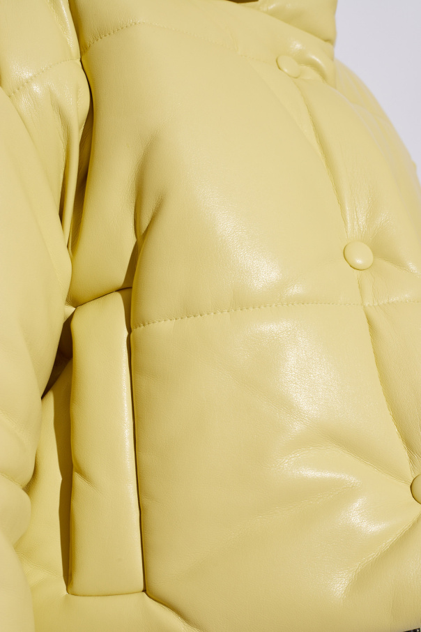 Light yellow ‘Aveline’ puffer jacket from Nanushka. Made from OKOBOR™ vegan leather with an oversize fit, this style fastens via snap and features a high-neck collar with a detachable hood, two slip pockets, long sleeves and a drawcord-adjustable hem. OKOBOR™ is exclusive to Nanushka. Their new alternative to leather has 100% recycled backing and a more responsible composition.