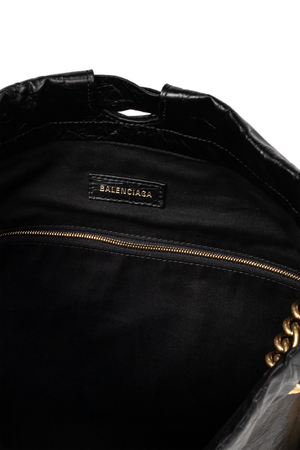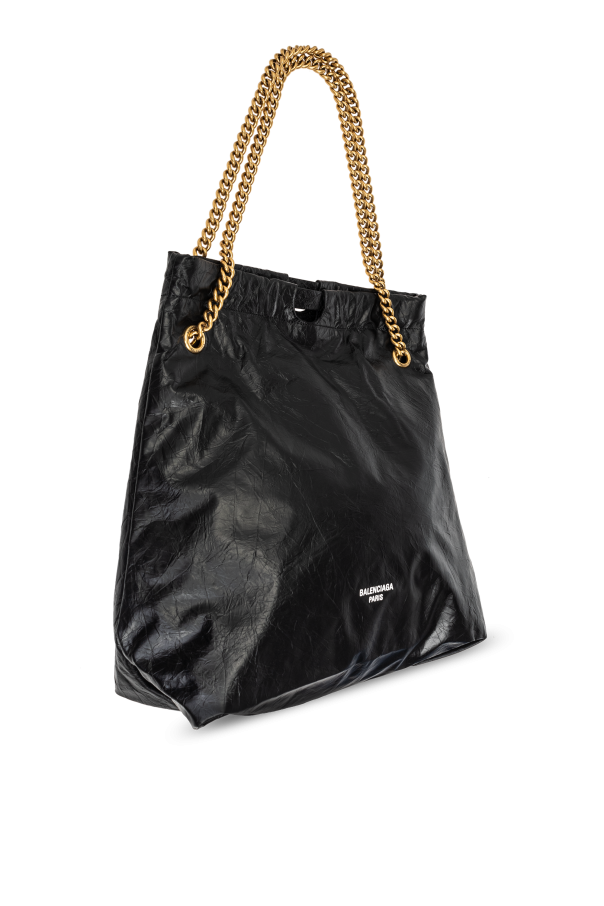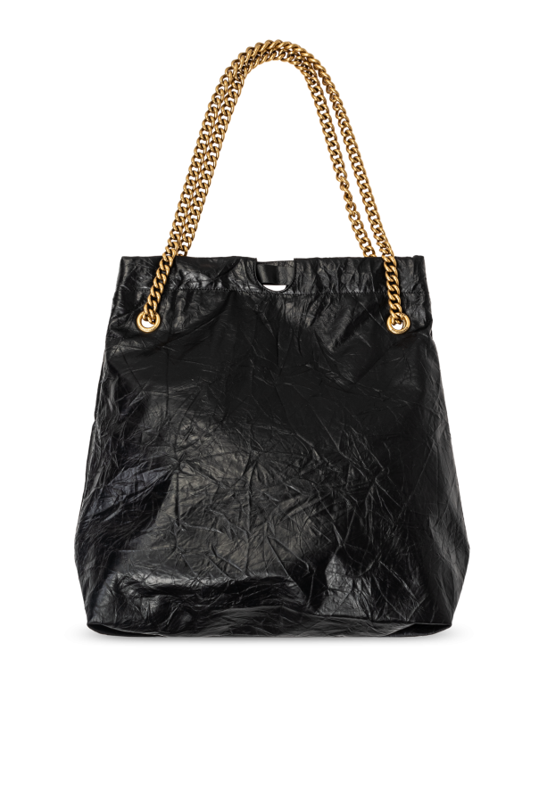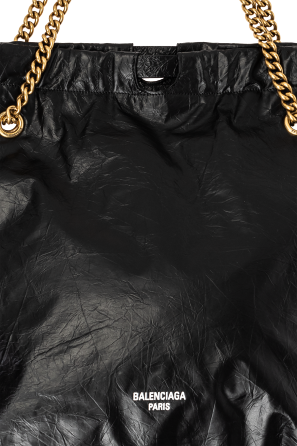 Introducing the ‘Crush Medium’ Shopper Bag by the illustrious Balenciaga, a testament to the harmony of minimalist design and luxurious detailing. Crafted from a supple, black material that mimics the texture of leather, this bag exudes a sophisticated, yet slightly informal character thanks to its natural creases and folds. The bag's allure is amplified by its thick, gold chain handles, which are affixed with golden fixtures, introducing a touch of opulence. A small, metallic plaque bearing the designer's logo graces the front, providing a subtle nod to its prestigious origins. The interior, lined with a high-quality fabric, features a compartment and a zippered pocket, ensuring both elegance and functionality. The ‘Crush Medium’ transcends the ordinary shopper bag with its blend of simplicity and luxury. Its dominant black hue ensures versatility, while the golden accents highlight its exclusive nature. Presented on a model, it offers a glimpse into its practical elegance and size proportion, making it an indispensable accessory for everyday wear. Why Purchase This Product? Exclusive design from Balenciaga, synonymous with luxury and quality. Elegant, black leather-like material with a unique texture. Luxurious gold chain handles and logo plaque as distinctive features. Functional interior with a compartment and a zippered pocket for organization. Perfect blend of minimalist design and practicality, suited for various styles.