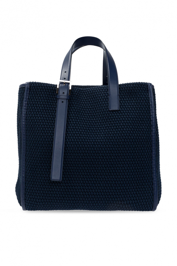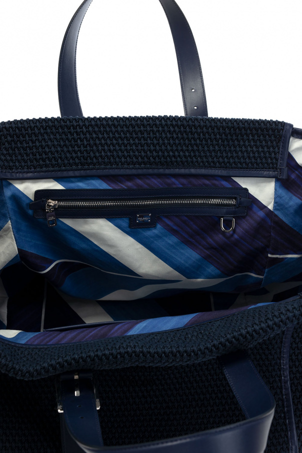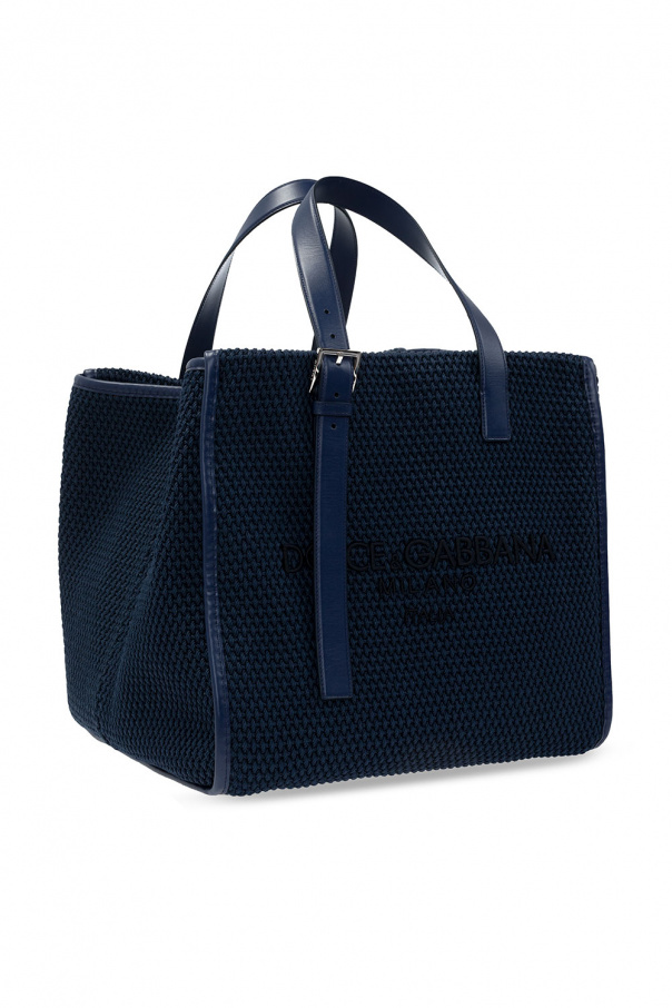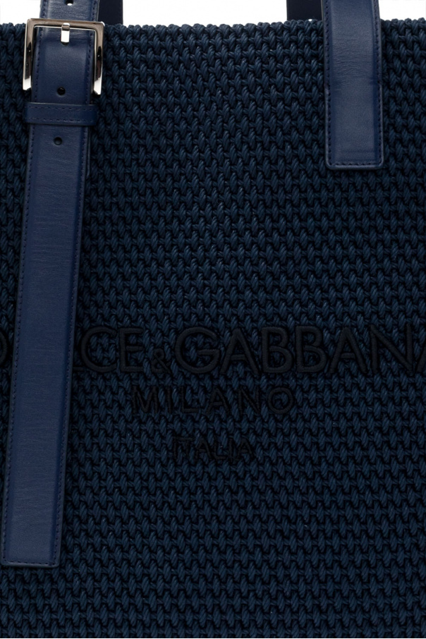 Navy blue woven shopper bag from Dolce & Gabbana. Embroidered with the brand's logo on the front, this design features two adjustable half-round handles and one internal compartment with one zip pocket and two slip pockets.