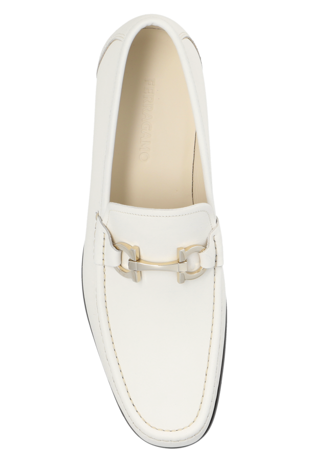Cream ‘Grandioso2’ loafers from FERRAGAMO. Made of smooth leather, this model sits on a black rubber sole and showcases silver-tone Gancini hardware on the front. Extrawide insole.