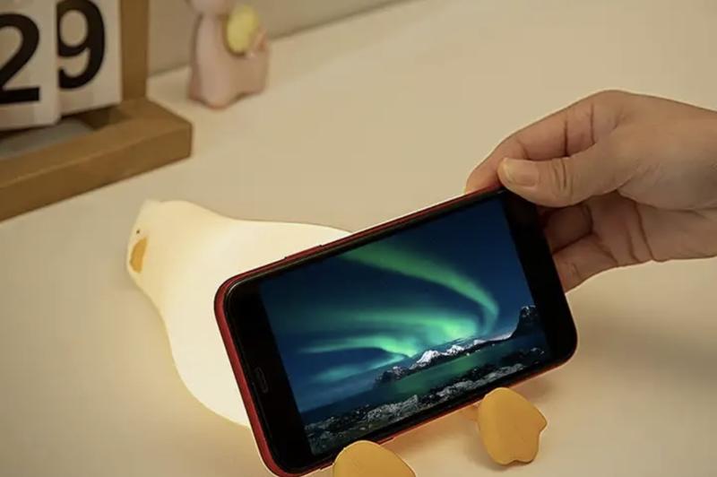 нічник світиться теплим жовтий кольором, підставка для телефона, працює від шнура