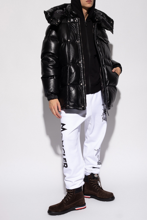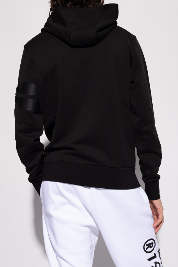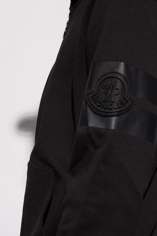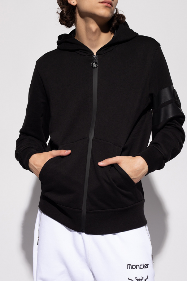 Black hoodie from Moncler. Made of wool, this model fastens with a zip and is complete with printed stripes, a raised logo appliqué, two front pockets and ribbed trims at the hem and cuffs.