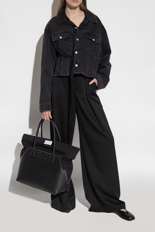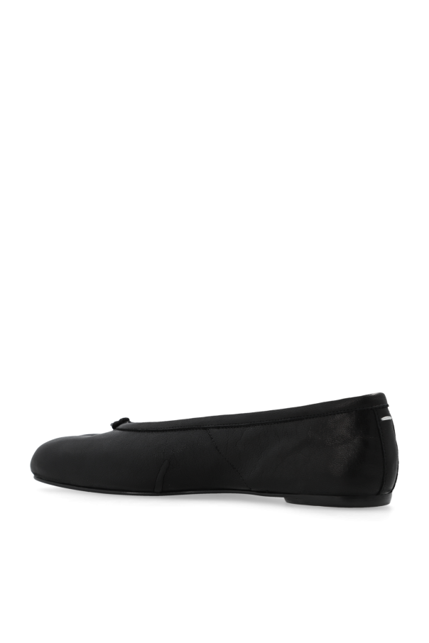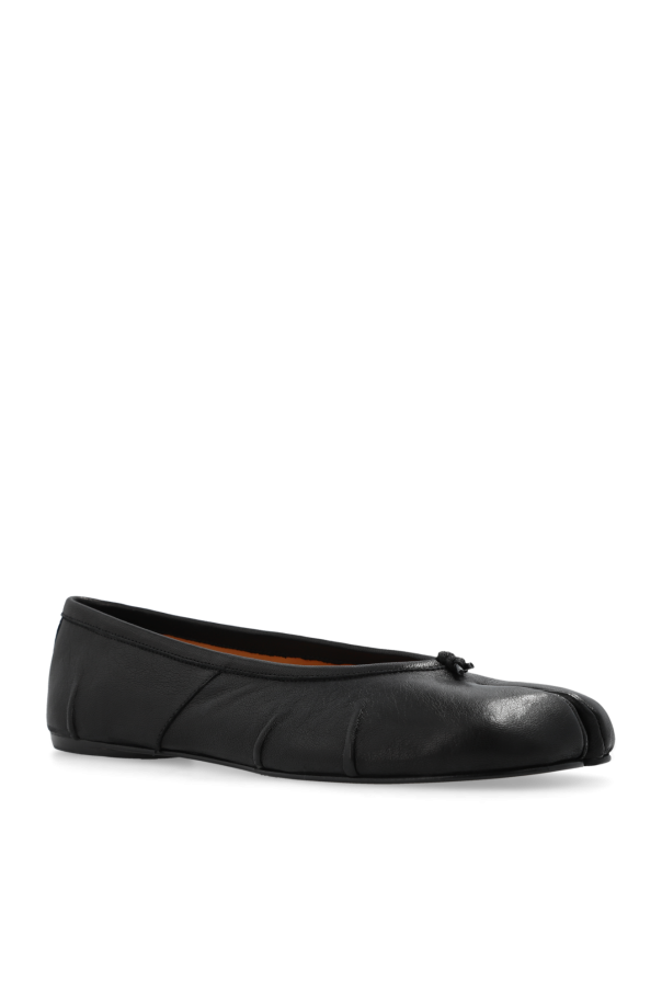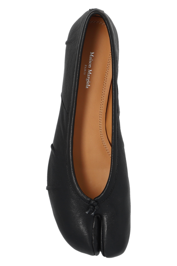 Black ballet flats from Maison Margiela. Made of leather with a vintage effect, this model sits on a beige leather sole and showcases the iconic ‘Tabi’ split toe and decorative trims.